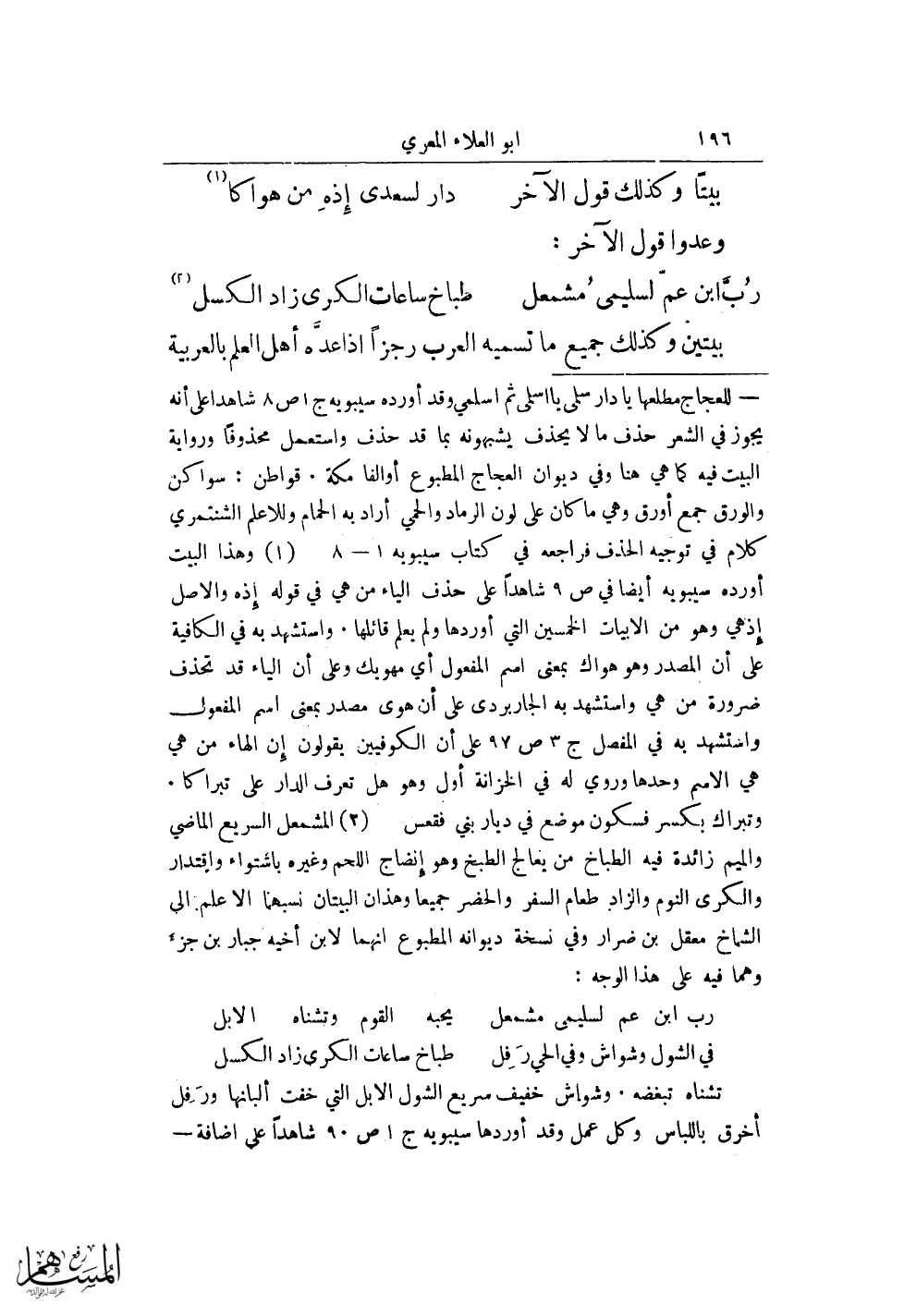 (¬2) المشمعل السريع الماضي والميم زائدة فيه الطباخ من يعالج الطبخ وهو إنضاج اللحم وغيره باستواء واقتدار والكرى النوم والزاد طعام السفر والحضر جميعًا وهذان البيتان نسبهما الاعلم إلى الشماخ معقل بن ضرار وفي نسخة ديوانه المطبوع أنهما لأبن أخيه جبار بن جزء وهما فيه على هذا الوجه: