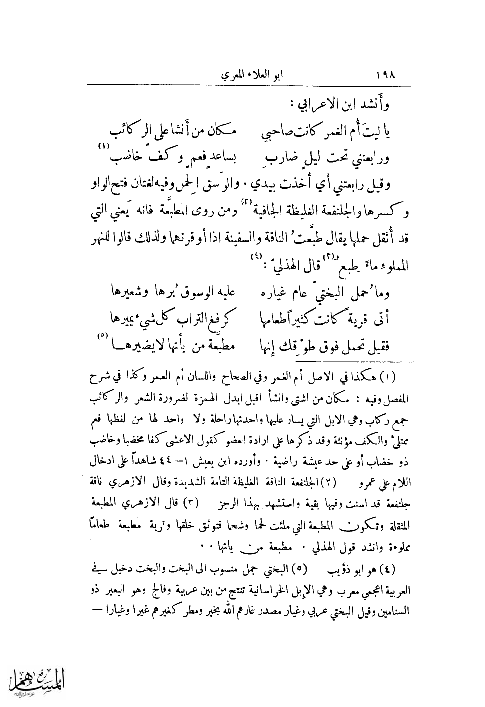 (¬1) هكذا في الأصل أم الغمر وفي الصحاح واللسان أم العمر وكذا في شرح المفصل وفيه: مكان من اشتى وانشأ اقبل ابدل الهمزة لضرورة الشعر والركائب جمع ركاب وهى الإبل التي يسار عليها واحدتها راحلة ولا واحد لها من لفظها فعم ممتلئ والكف مؤنثة وقد ذكرها على إرادة العضو كقول الأعشى كفا مخضبا وخاضب ذو خضاب أو على حد عيشة راضية. وأورده ابن يعيش 1 - 44 شاهدًا على إدخال اللام على عمرو.
