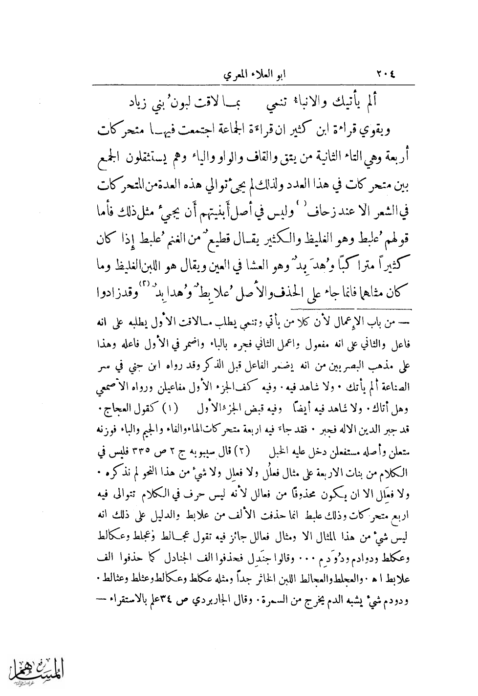 (¬1) كقول العجاج. قد جبر الدين الاله فجبر. فقد جاء فيه اربعة متحركات الهاء والفاء والجيم والباء فوزنه متعلن وأصله مستفعلن دخل عليه الخبل.