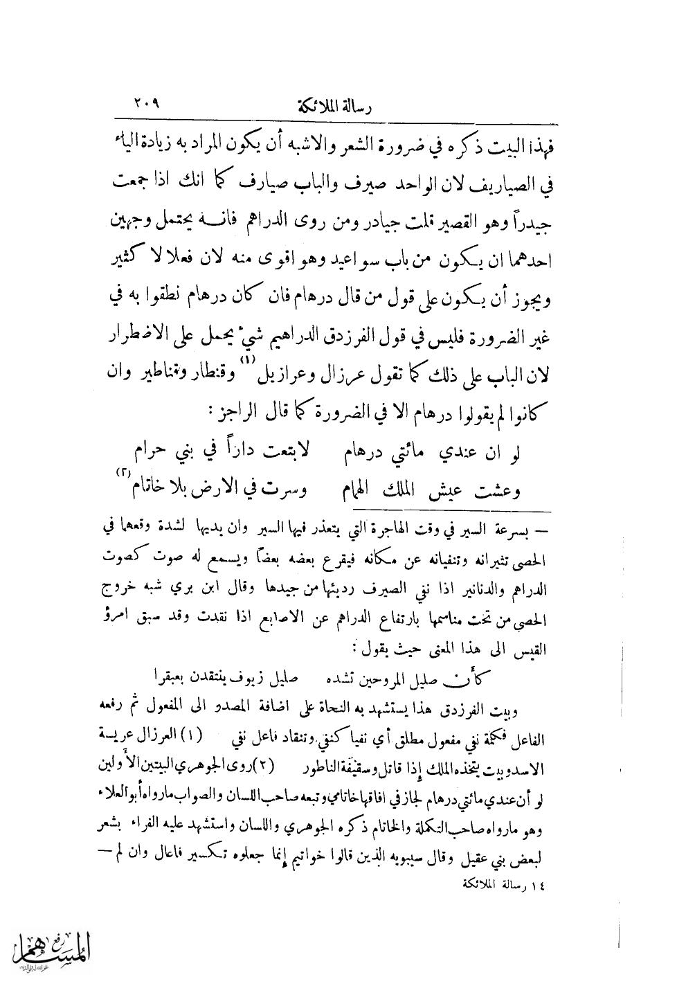 (¬2) روى الجوهري البيتين الأولين لو أن عندي مائتي درهام لجاز في افاقها خاتامي وتبعه صاحب اللسان والصواب ما رواه أبو العلاء وهو ما رواه صاحب التكملة والخاتام ذكره الجوهري واللسان واستشهد عليه الفراء بشعر لبعض بني عقيل وقال سيبويه الذين قالوا خواتيم إنما جعلوه تكسير فاعال وإن لم =