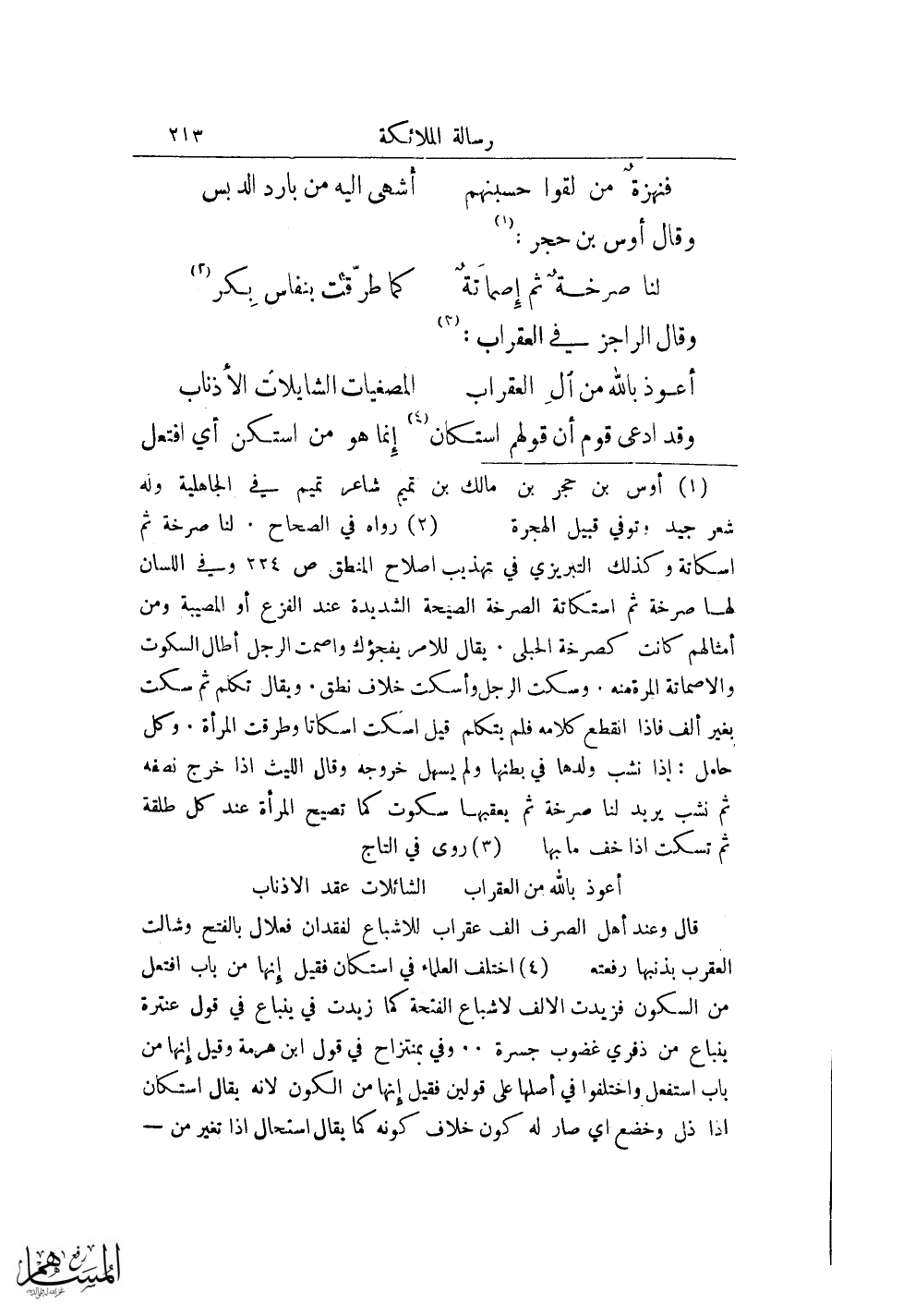 (¬2) رواه في الصحاح. لنا صرخة ثم اسكاته وكذلك التبريزي في تهذيب اصلاح المنطق ص 224 وفي اللسان لها صرخة ثم استكاتة الصرخة الصيحة الشديدة عند الفزع أو المصيبة ومن أمثالهم كانت كصرخة الحبلى. يقال للامر يفجؤك واصمت الرجل أطال السكوت والاصماتة المرة منه. وسكت الرجل وأسكت خلاف نطق. ويقال تكلم ثم سكت بغير ألف فاذا انقطع كلامه فلم يتكلم قيل اسكت اسكاتا وطرقت المرأة. وكل حامل: إذا نشب ولدها في بطنها ولم يسهل خروجه وقال الليث اذا خرج نصفه ثم نشب يريد لنا صرخة ثم يعقبها سكوت كما تصيح المرأة عند كل طلقة ثم تسكت اذا خف ما بها.
