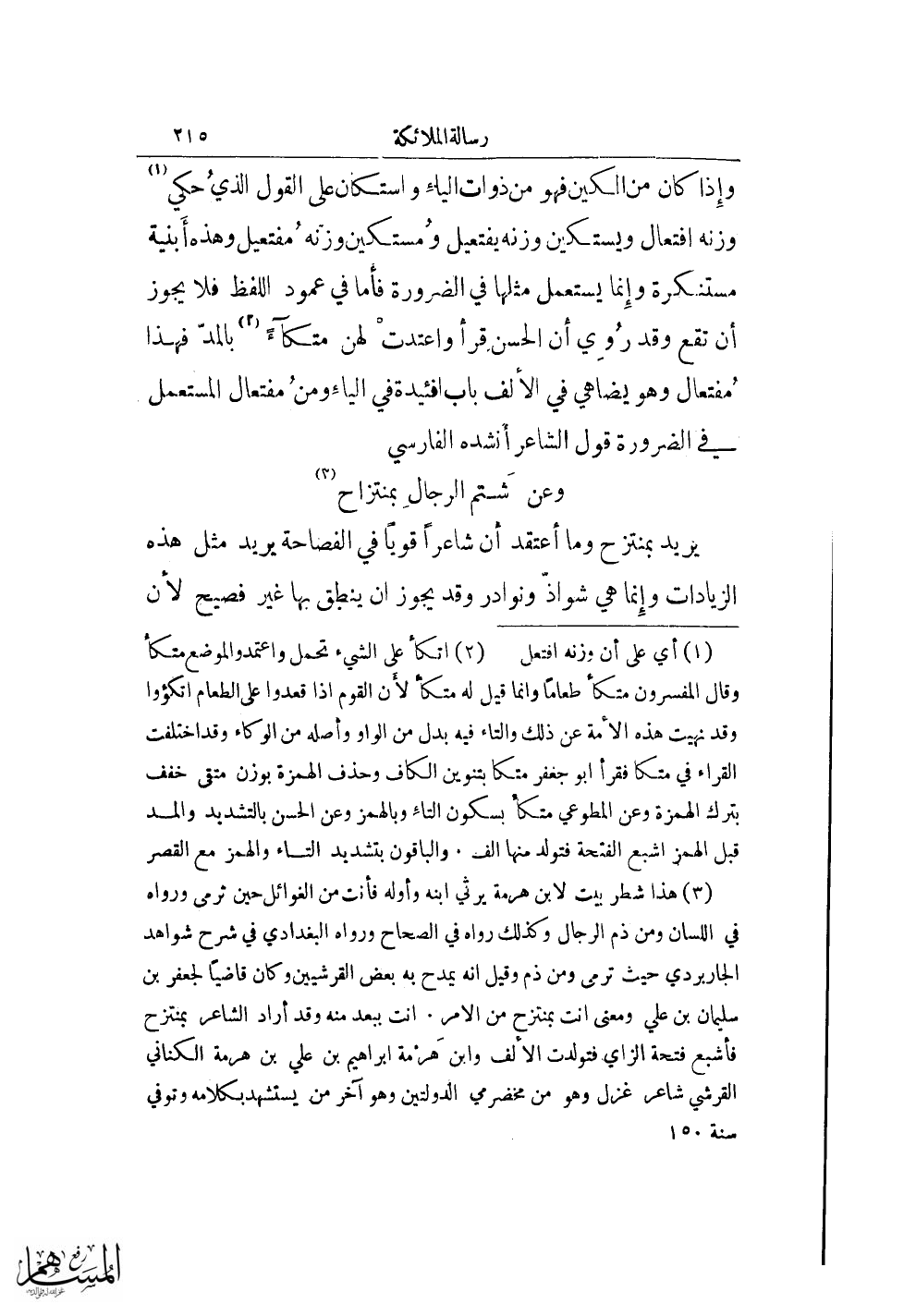 (¬3) هذا شطر بيت لابن هرمة يرثي ابنه وأوله فأنت من الغوائل حين ترمي ورواه في اللسان ومن ذم الرجال وكذلك رواه الصحاح ورواه البغدادي في شرح شواهد الجاربردي حيث ترمى ومن ذم وقي انه يمدح به بعض القرشيين وكان قاضياً لجعفر بن سليمان بن علي ومعنى انت بمنتزح من الامر. انت ببعد منه وقد أراد الشاعر بمنتزح فأشبع فتحة الزاي فتولدت الألف وابن هرمة ابراهيم بن علي بن هرمة الكناني القرشي شاعر غزل وهو من مخضرمي الدولتين وهو آخر من يستشهد بكلامه وتوفي سنة 150.