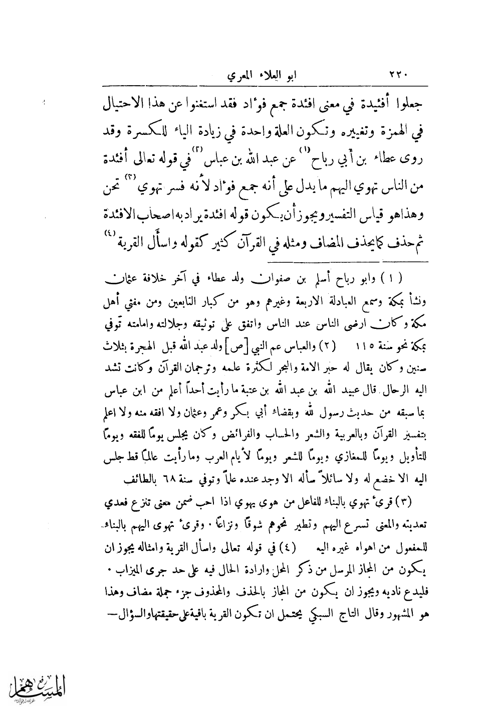 جعلوا أفئيدة في معنى افئدة جمع فؤاد فقد استغنوا عن هذا الاحتيال في الهمزة وتغييره وتكون العلة واحدة في زيادة الياء للكسرة وقد روى عطاء بن أبي رباح (¬1) عن عبد الله بن عباس (¬2) في قوله تعالى أفئدة من الناس تهوي اليهم ما يدل على أنه جمع فؤاد لأنه فسر تهوي (¬3) تحن وهذا هو قياس التفسير ويجوز أن يكون قوله افئدة يراد به اصحاب الافئدة ثم حذف كما يحذف المضاف ومثله في القرآن كثير كقوله واسأل القرية (¬4)