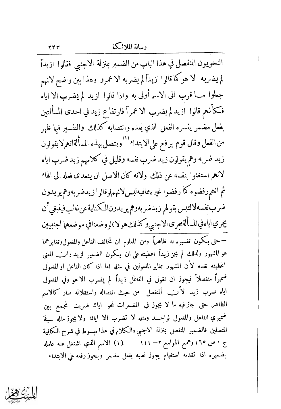 = حتى يكون تفسيره له ظاهراً ومن المعلوم أن تخالف الفاعل والمفعول وتغايرهما هو المشهور ولذلك لم يجز زيدًا اعطيته على ان يكون الضمير لزيد وان المعنى اعطيته نفسه لأن المشهور تغاير المفعولين في مثله أما إذا كان الفاعل أو المفعول ضميرًا منفصلًا فيجوز أن تقول في الفاعل زيدًا لم يضرب الا هو وفي المفعول اياه ضرب زيد لأن المنفصل من حيث انفصاله واستقلاله صار كالأسم الظاهر حتى جاز فيه ما لا يجوز في المضمرات نحو اياك ضربت تجمع بين ضميري الفاعل والمفعول لواحد ومثله لا تضرب إلا إياك ولا يجوز مثله في المتصلين فالضمير المنفصل بمنزلة الأجنبي والكلام في هذا مبسوط في شرح الكافية ج 1 ص 165 وهمع الهوامع 2 - 111.
