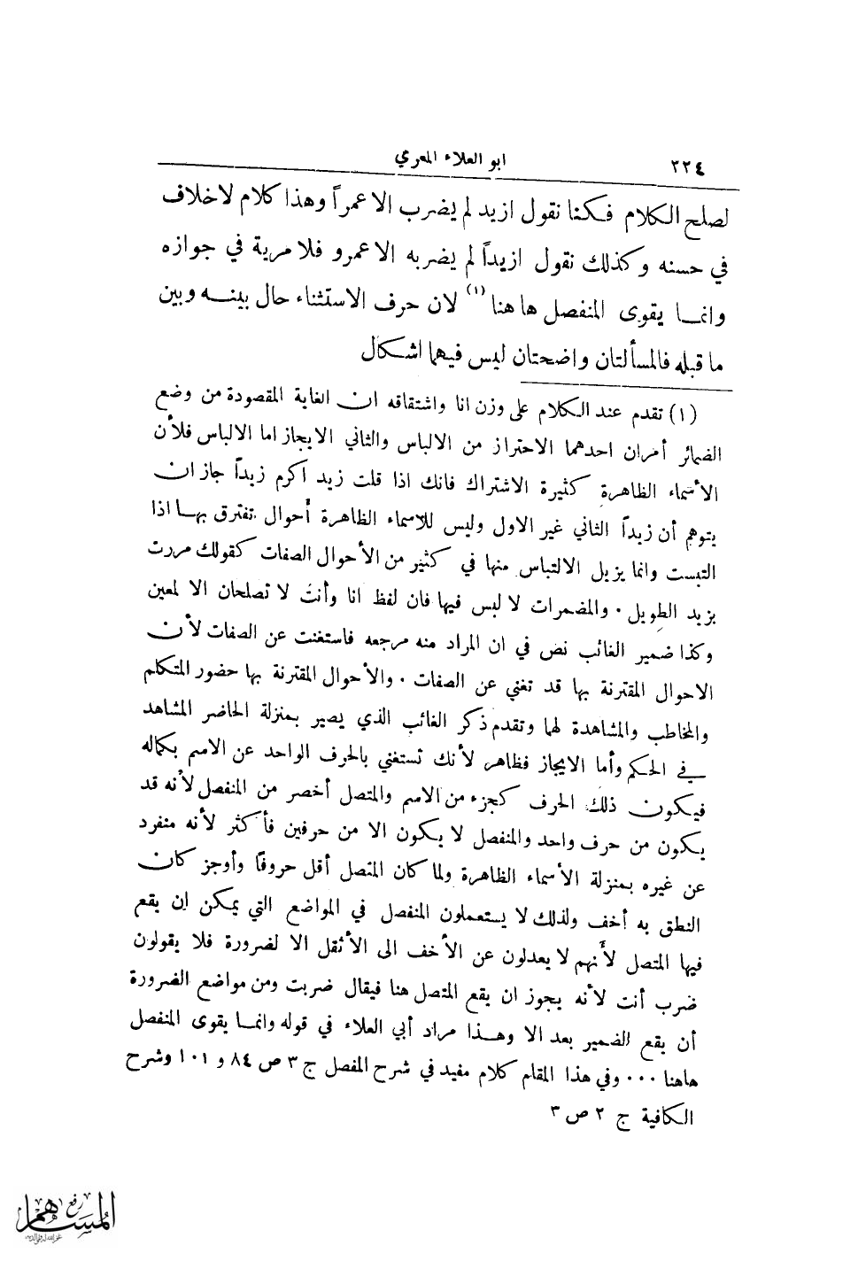 (¬1) تقدم عند الكلام على وزن انا واشتقاقه ان الغاية المقصودة من وضع الضمائر أمران احدهما الاحتراز من الالباس والثاني الايجاز أما الالباس فلأن الأسماء الظاهرة كثيرة الاشتراك فإنك اذا قلت زيد اكرم زيدًا جاز أن يتوهم أن زيداً الثاني غير الأول وليس للاسماء الظاهرة أحوال تفترق بها اذا التبست وانما يزيل الالتباس منها في كثير من الأحوال الصفات كقولك مررت بزيد الطويل. والمضمرات لا لبس فيها فان لفظ انا وأنت لا تصحان الا لمعين وكذا ضمير الغائب نص في ان المراد منه مرجعه فاستغنت عن الصفات لأن الاحوال المقترنة بها قد تغني عن الصفات. والأحوال المقترنة بها حضور المتكلم والمخاطب والمشاهدة لهما وتقدم ذكر الغائب الذي يصير بمنزلة الحاضر المشاهد في الحكم وأما الإيجاز فظاهر لأنك تستغني بالحرف الواحد عن الاسم بكماله فيكون ذلك الحرف كجزء من الاسم والمتصل أخصر من المنفصل لأنه قد يكون من حرف واحد والمنفصل لا يكون الا من حرفين فأكثر لأنه متفرد عن غيره بمنزلة الاسماء الظاهرة ولما كان المتصل أقل حروفاً وأوجز كان التعلق به أخف ولذلك لا يستعملون المنفصل في المواضع التي يمكن ان يقع فيها المتص لأنهم لا يعدلون عن الأخف إلى الأثقل الا لضرورة فلا يقولون ضرب أنت لأنه يجوز ان يقع المتصل هنا فيقال ضربت ومن مواضع الضرورة أن يقع الضمير بعد الا وهذا مراد أبي العلاء في قوله وانما يقوى المنفصل ها هنا ... وفي هذا المقام كلام مفيد في شرح المفصل ج 3 ص 84 و 101 وشرح الكافية ج 2 ص 3.