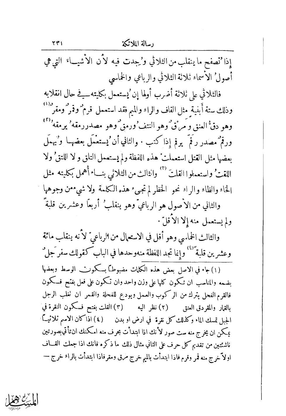 (¬4) اذا كان الاسم ثلاثياً يمكن أن يخرج منه ست صور لأنك اذا ابتدأت بحرف منه امكنك ان تأتي بصورتين ناشئتين من تقديم كل حرف على الثاني مثال ذلك ما ذكره فانك اذا جعلت القاف أولًا خرج منه قمر وقرم فاذا ابتدأ بالميم خرج مرق ومقر فاذا ابتدأت بالراء خرج =