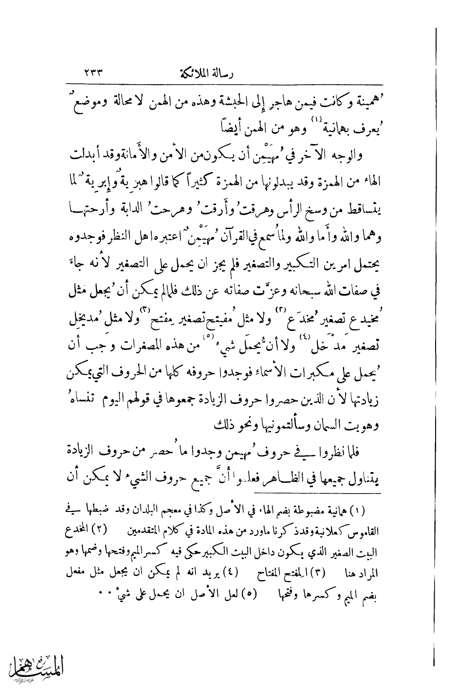 والوجه الآخر في مهيمن أن يكون من الأمن والأمانة وقد أبلدت الهاء من الهمزة وقد يبدلونها من الهمزة كثيرًا كما قالوا هبرية وإبرية لما يتساقط من وسخ الرأس وهرقت وأرقت وهرحت الدابة وأرحتها وهما والله وأما والله ولما سمع في القرآن مهيمن اعتبره أهل النظر فوجدوه يحتمل أمرين التكبير والتصغير فلم يجز أن يحمل على التصغير لأنه جاء في صفات الله سبحانه وعزَّت صفاته عن ذلك فلما لم يمكن أن يجعل مثل مخدع تصغير مخدع (¬2) ولا مثل مفيتح تصغير مفتح (¬3) ولا مثل مديخل تصغير مدخل (¬4) ولا أن يحمل شيء (¬5) من هذه المصغرات وجب أن يحمل على مكبرات الأسماء فوجدوا حروفه كلها من الحروف التي يمكن زيادتها لأن الذين حصروا حروف الزيادة جمعوها في قولهم اليوم تنساه وهويت السمان وسالتمونيها ونحو ذلك.