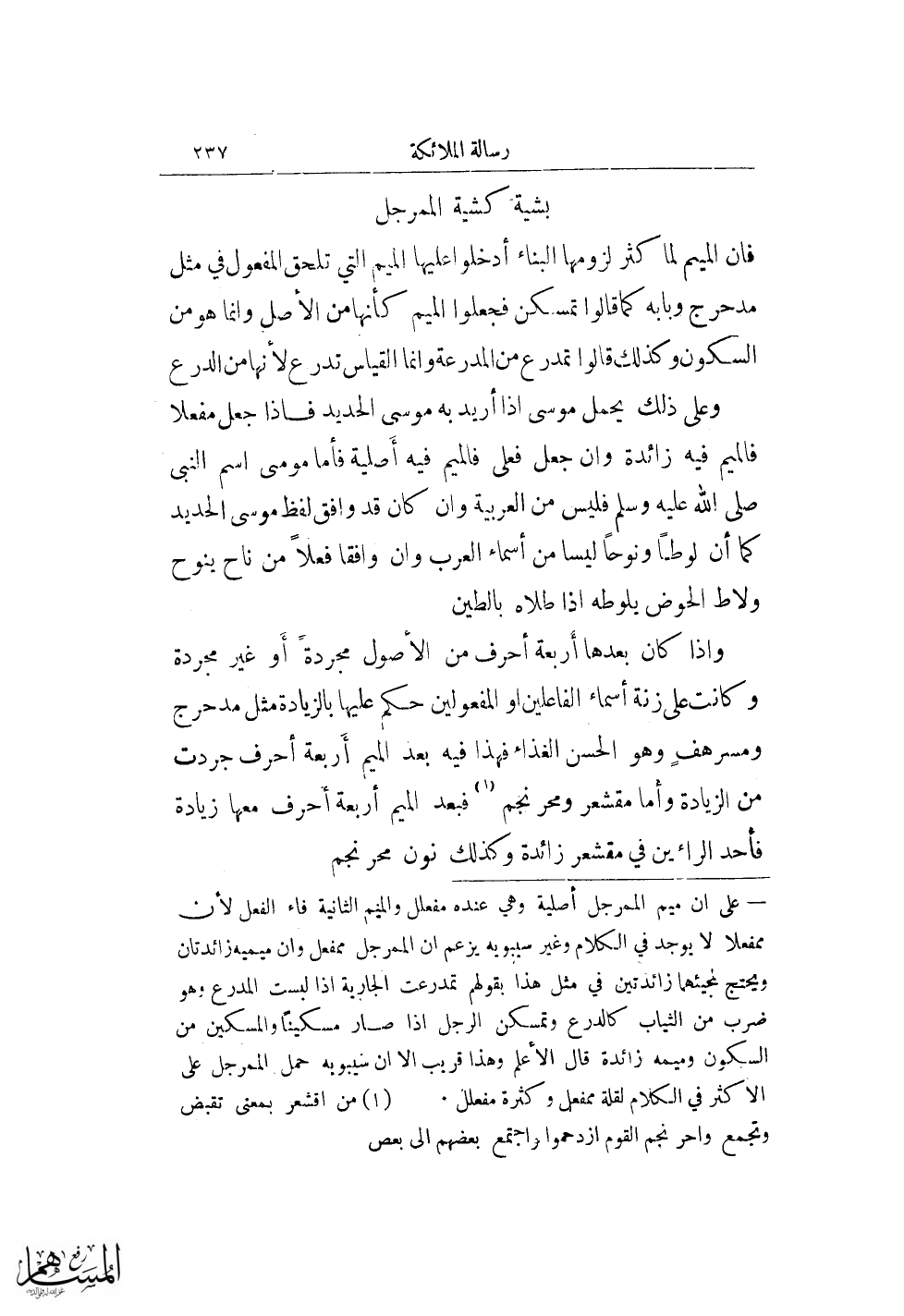 واذا كان بعدها أربعة أحرف من الأصول مجردة أو غير مجردة وكانت على زنة أسماء الفاعلين او المفعولين حكم عليها بالزيادة مثل مدحرج ومسرهفٍ وهو الحسن الغذاء فهذا فيه بعد الميم أربعة أحرف جردت من الزيادة وأما مقشعر ومحر نجم (¬1) فبعد الميم أربعة أحرف معها زيادة فأحد الراءين في مقشعر زائدة وكذلك نون محر نجم.