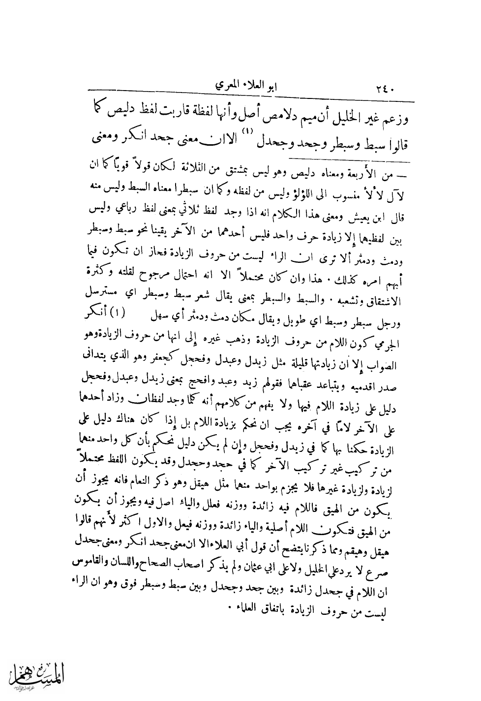 = من الأربعة ومعناه دليص وهو لي سبمشتق من الثلاثة لكان قولاً قويًا كما أن لآل لألأ منسوب إلى اللؤلؤ وليس من لفظه وكما أن سبطرا معناه السبط وليس منه قال ابن يعيش ومعنى هذا الكلام أنه إذا وجد لفظ ثلاثي بمعنى لفظ رباعي وليس بين لفظيهما إلا زيادة حرف واحد فليس أحدهما من الآخر يقينا نحو سبط وسيطر ودمث ودمثر ألا ترى أن الراء ليست من حروف الزيادة فحاز أن تكون فيما أبهم امره كذلك. هذا وإن كان محتملاً إلا أنه احتمال مرجوح لقلته وكثرة الاشتقاق وتشبعه. السبط والسبطر بمعنى يقال شعر سبط وسبطر أي مسترسل ورجل سبطر وسبط أي طويل ويقال مكان دمث أي سهل (1) أنكر الجرمي كون اللام من حروف الزيادة وذهب غيره إلى أنها من حروف الزيادة وهو الصواب إلا أن زيادتها قليلة مثل زيدل وعبدل وفحجل كجعفر وهو الذي يتدانى صدر اقدميه ويتباعد عقباهما فقولهم زيد وعبد وافحج بمعنى زيدل وعبدل وفحجل دليل على زيادة اللام فيها ولا يفهم من كلامهم أنه كلما وجد لفظان وزاد أحدهما على الآخر لامّا في أخره يجب أن نحكم بزيادة اللام بل إذا كان هناك دليل على الزيادة حكمنا بها كما في زيدل وفحجل وإن لم يكن دليل نحكم بأن كل واحد منهما من نركيب غير الآخر كما في حجد وحجدل وقد يكون اللفظ محتملاً لزيادة ولزيادة غيرها فلا يجزم بواحد منهما مثل هيقل وهو ذكر النعام فإنه يجوز أن يكون من الهيق فاللام فيه زائدة ووزنه فعلل والياء أصل فيه ويجوز أن يكون من الهيق فتكون اللام أصلية والياء زائدة ووزنه فيعل والأول أكثر لأنهم قالوا هيقل وهيقم ومما ذكرنا يتضح أن قول أبي العلاء ألا أن معنى جحد أنكر ومعنى جحدل صرع لا يرد على الخليل ولا على أبي عثمان ولم يذكر أصحاب الصحاح واللسان والقاموس أن اللام في جحدل زائدة وبين جحد وجحدل وبين سبط وسبطر فوق وهو أن الراء ليست من حروف الزيادة باتفاق العلماء.
