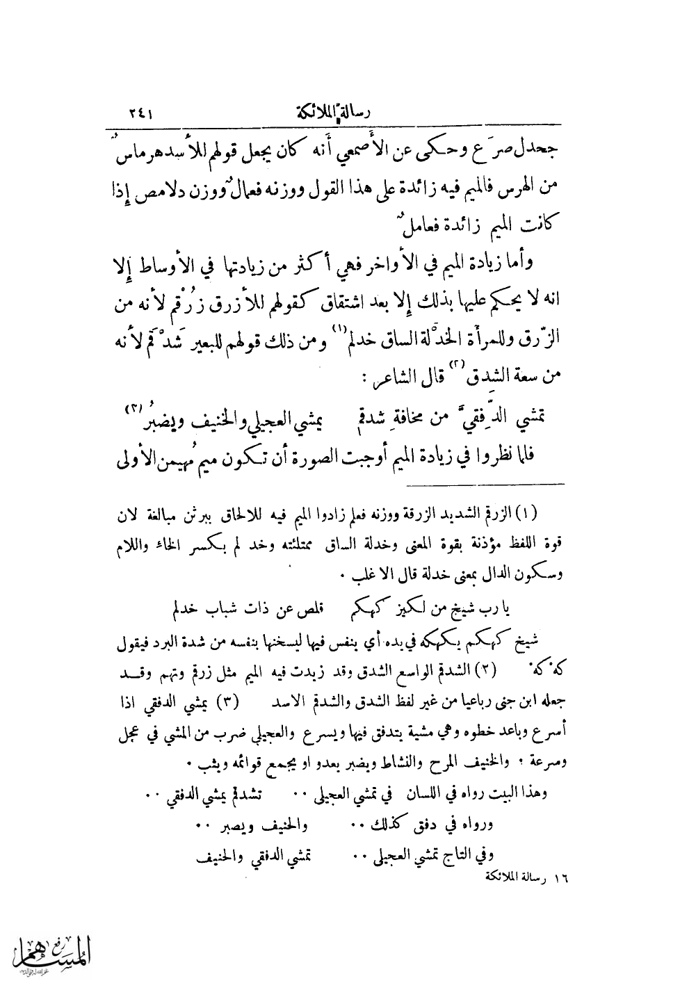 وأما زيادة الميم في الأواخر فهي أكثر من زيادتها في الأوساط إلا أنه لا يحكم عليها بذلك إلا بعد اشتقاق كقولهم للأزرق زرقم لأنه من الزرق وللمرأة الخدلة الساق خد لم (¬1) ومن ذلك قولهم للبعير شد قم لأنه من سعة الشدق (¬2) قال الشاعر: