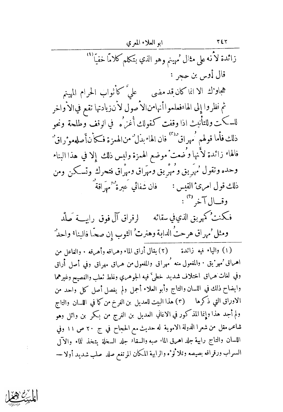 (¬2) يقال أراق الماء وهراقه وأهرقه. والفاعل من اهراق مهربق. والمفعول منه مهراق والمفعول من هراق مهراق وفي أصل أراق وفي لغات هراق اختلاف شديد خطئ فيه الجوهري وغلط ثعلب والفصيح وغيرهما وإيضاح ذلك في اللسان والتاج وأبو العلاء أجمل ولم يفصل أصل كل واحد من الأوراق التي ذكرها