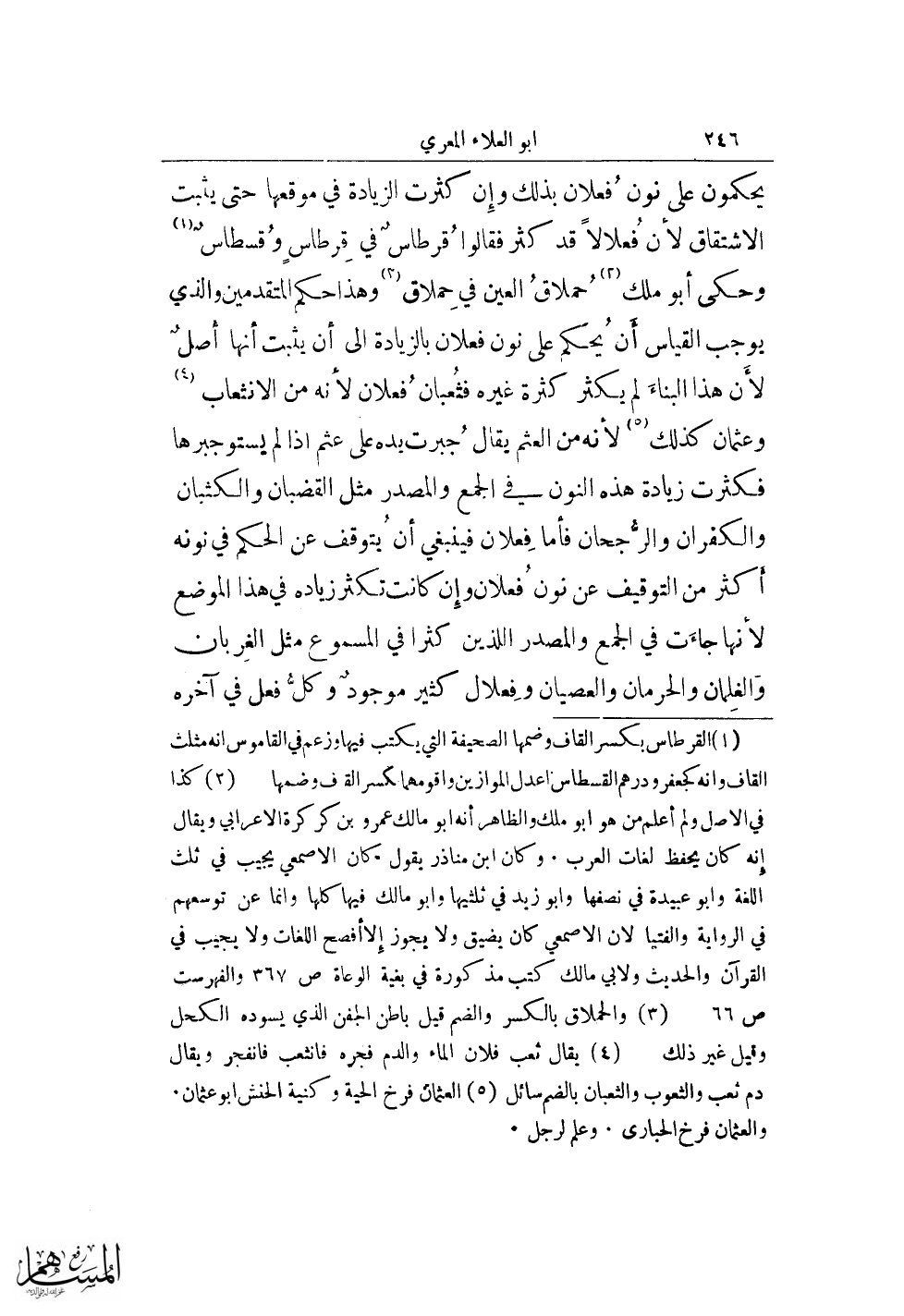 يحكمون على نون فعلان بذلك وإن كثرت الزيادة في موقعها حتى يثبت الاشتقاق لأن فعلالاً قد كثر فقالوا قرطاس في قرطاس وقسطاطس (¬1) وحكى أبو ملك (¬2) حملاق العين في حملاق (¬3) وهذا حكم المتقدمين والذي يوجب القياس أن يحكم على نون فعلان بالزيادة إلى أن يثبت أنها أصل لأن هذا البناء لم يكثر كثرة غيره فثعبان فعلان لأنه من الانثعاب (¬4) وعثمان كذلك (¬5) لأنه من العثم يقال جبرت يده على عثم إذا لم يستوجبرها فكثرت زيادة هذه النون في الجمع والمصدر مثل القضبان والكثبان والكفران والرجحان فأما فعلان فينبغي أن يتوقف عن الحكم في نونه أكثر من التوقيف عن نون فعلان وإن كانت تكثر زياده في هذا الموضع لأنها جاءت في الجمع والمصدر اللذين كثرا في المسموع مثل الغربان والغلمان والحرمان والعصيان وفعلال كثير موجود وكل فعل في آخره