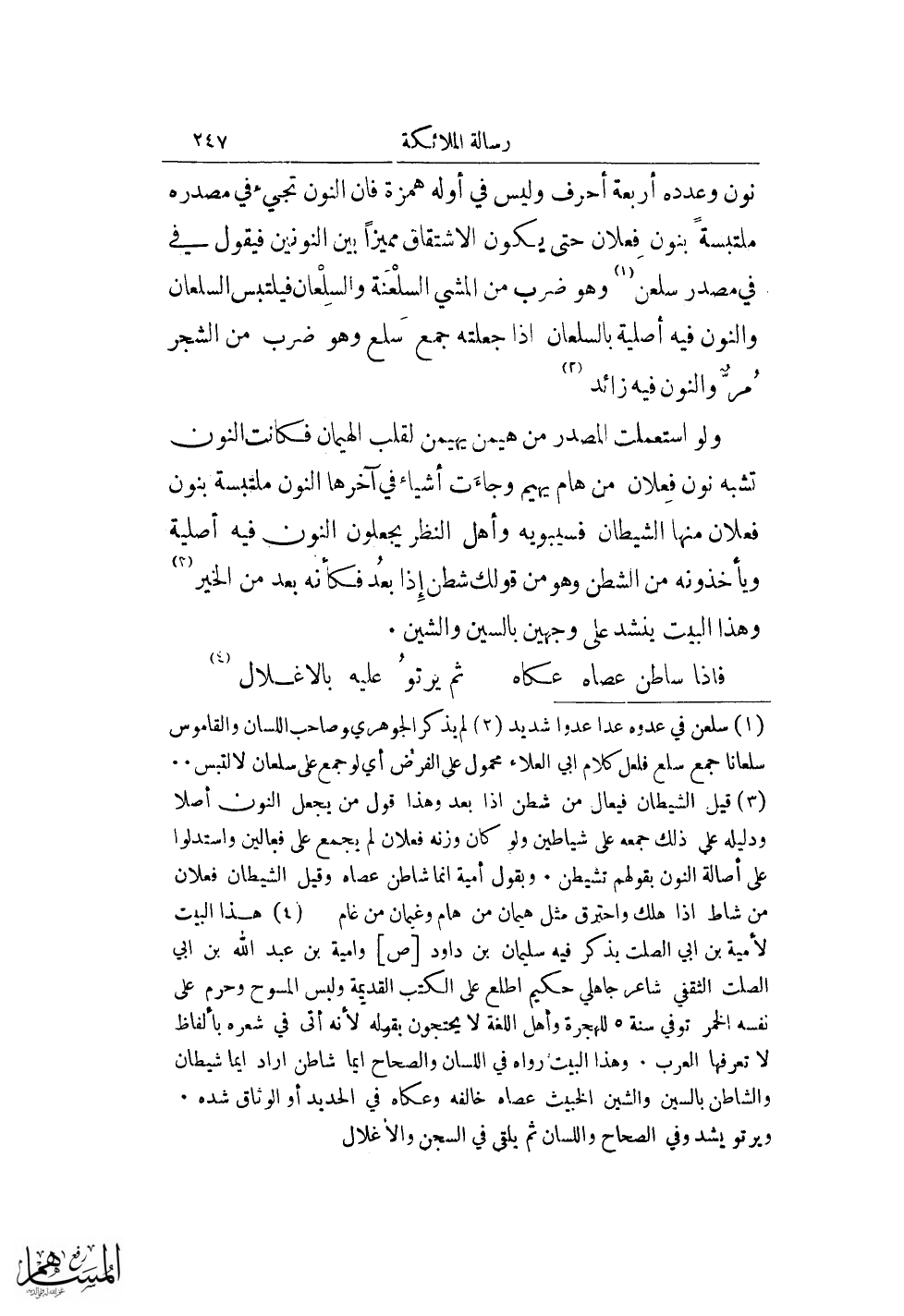 (¬3) قيل الشيطان فيعال من شطن إذا بعد وهذا قول من يجعل النون أصلا ودليله على ذلك جمعه على شياطين ولو كان وزنه فعلان لم يجمع على فعالين واستدلوا على أصالة النون بقولهم تشيطن. وبقول أمية إنما شاطن عصاه وقيل الشيطان فعلان من شاط إذا هلك واحترق مثل هيمان من هام وغيمان من غام