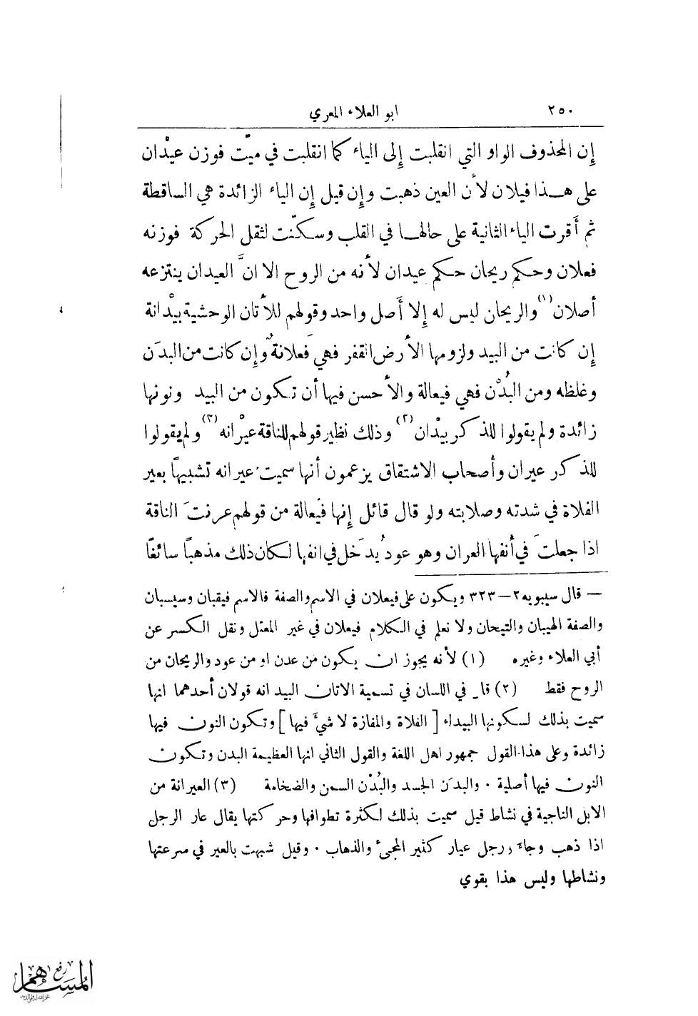 إن المحذوف الواو التي انقلبت إلى الياء كما انقلبت في ميّت فوزن عيدان على هذا فيلان لأن العين ذهبت وإن قيل إن الياء الزائدة هي الساقطة ثم أقرت الياء الثانية على حالها في القلب وسكنّت لثقل الحركة فوزنه فعلان وحكم ريحان حكم عيدان لأنه من الروح ألا أن العيدان ينتزعه أصلان (¬1) والريحان ليس له إلا أصل واحد وقولهم للأتان الوحشية بيدانة إن كانت من البيد ولزومها الأرض القفر فهي فعلانة وإن كانت من البدن وغلظة ومن البدن فهي فيعالة والأحسن فيها أن تكون من البيد ونونها زائدة ولم يقولوا للذكر بيدان (¬2) وذلك نظير قولهم للناقة عيرانه (¬3) ولم يقولوا للذكر عيران وأصحاب الاشتقاق يزعمون أنها سميت عيرانه تشبيهًا بعير الفلاة في شدته وصلابته ولو قال قائل إنها فيعالة من قولهم عرنت الناقة إذا جعلت في أنفها العران وهو عود يدخل في انفها لكان ذلك مذهبًا سائغًا