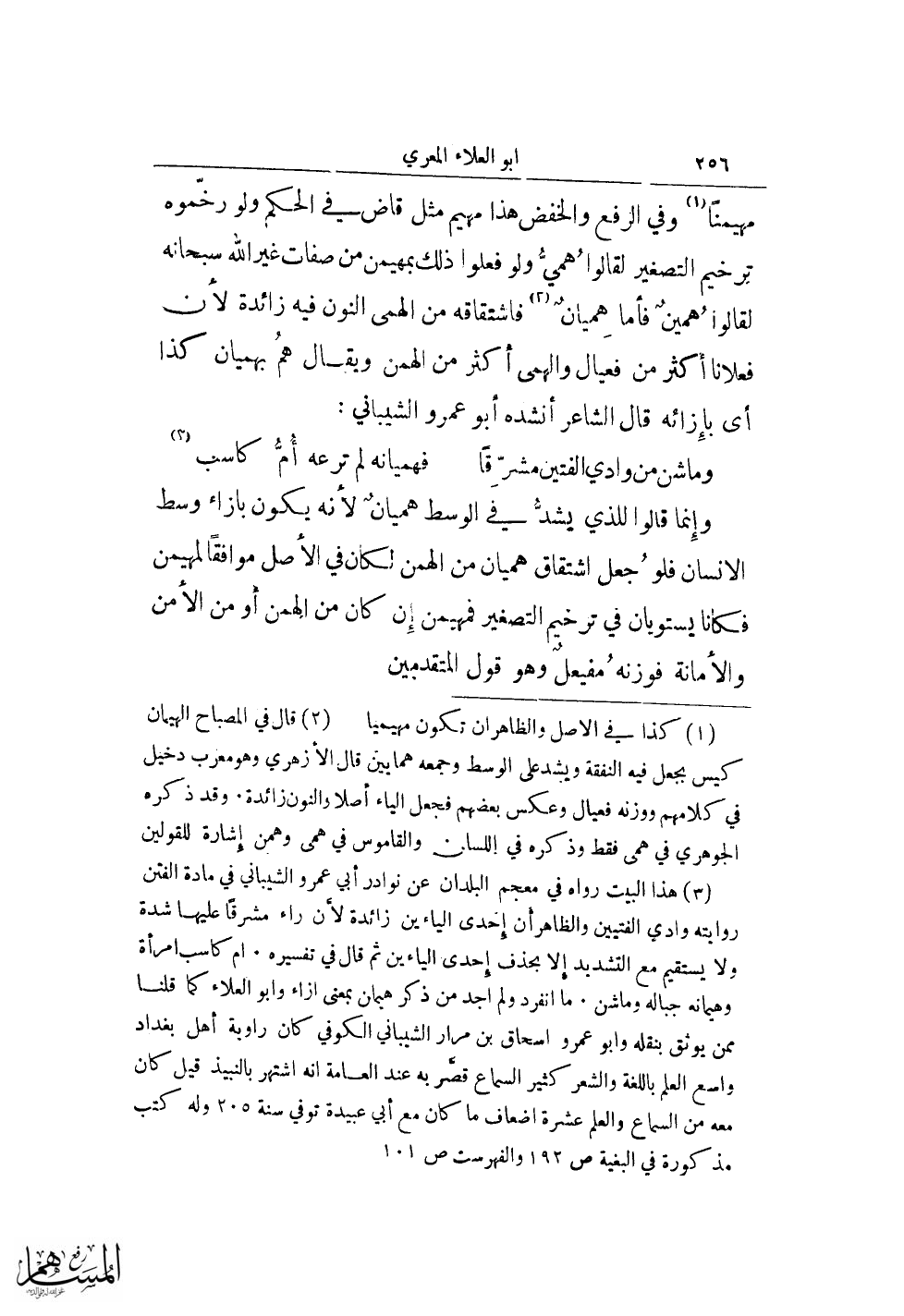 (¬3) هذا البيت رواه في معجم البلدان عن نوادر أبي عمرو الشيباني في مادة الفتن روايته وادي الفتيين والظاهر أن إحدى الياءين زائدة لأن راء مشرقًا عليها شدة ولا يستقيم مع التشديد إلا بحذف إحدى الياءين ثم قال في تفسيره. أم كاسب امرأة وهيمانه جباله وماشن. ما انفراد ولم أجد من ذكر هيمان بمعنى ازاء وأبو العلاء كما قلنا ممن يوثق بنقله وأبو عمرو واسحاق بن مرار الشيباني الكوفي كان رواية أهل بغداد واسع العلم باللغة والشعر كثير السماع قصر به عند العامة أنه اشتهر بالنبيذ قيل كان معه من السماع والعلم عشرة اضعاف ما كان مع أبي عبيدة توفي سنة 205 وله كتب مذكورة في البغية ص 192 والفهرست ص 101