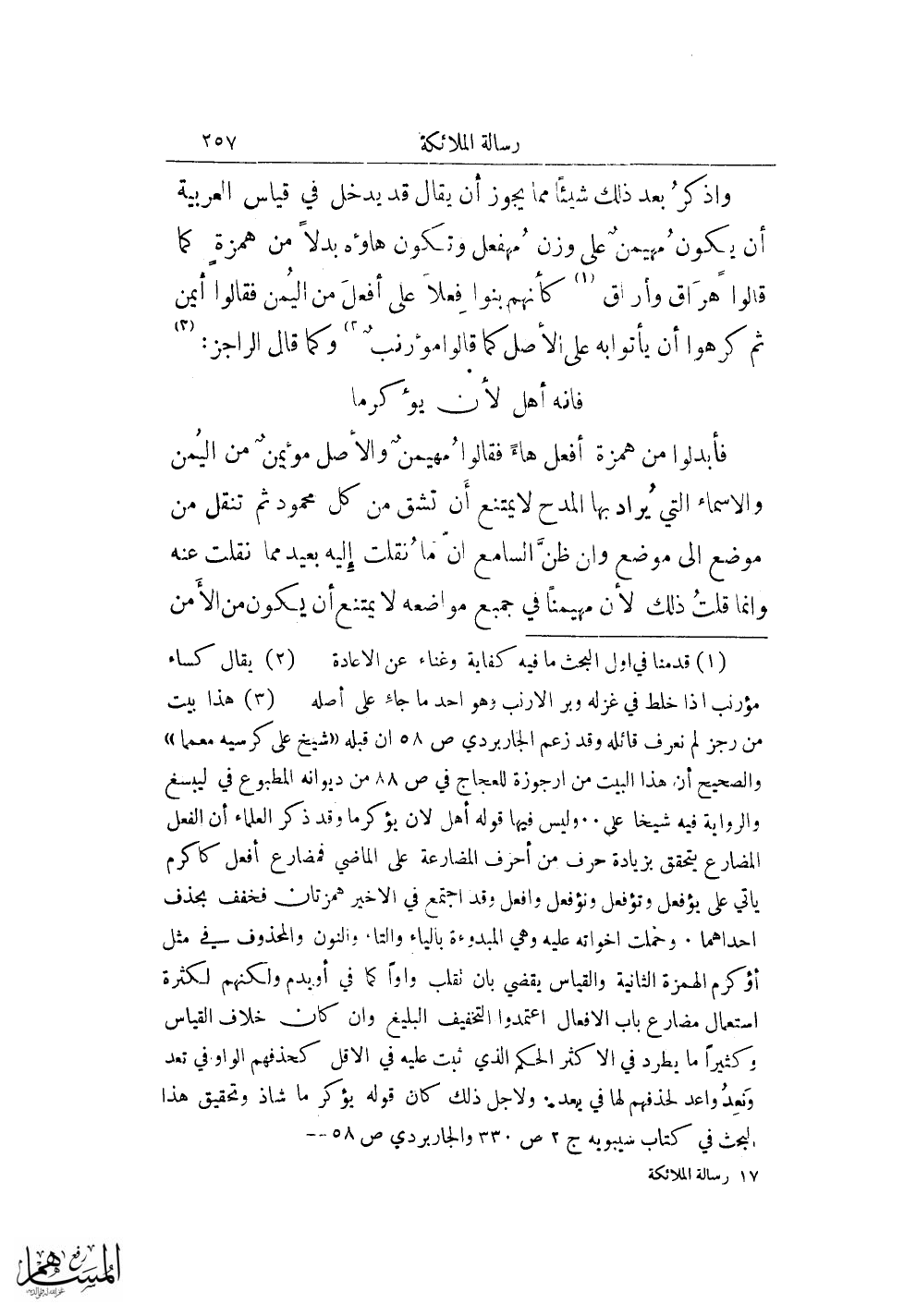 (¬3) هذا بيت من رجز لم نعرف قائله وقد زعم الجاربردي ص 58 أن قبله «شيخ على كرسيه معمما» والصحيح أن هذا البيت من ارجوزة للعجاج في ص 88 من ديوانه المطبوع في ليبسغ والرواية فيه شيخًا على ... وليس فيها قوله أهل لأن يؤكرما وقد ذكر العلماء أن الفعل المضارع يتحقق بزيادة حرف من أحرف المضارعة على الماضي فمضارع أفعل كاكرم ياتي على يؤفعل وتؤفعل ونؤفعل وافعل وقد اجتمع في الأخير همزتان فخفف بحذف أحداهما. وحملت أخواته عليه وهي المبدوءة بالياء والتاء والنون والمحذوف في مثل أؤكرم الهمزة الثانية والقياس يقضي بان تقلب واوًا كما في أويدم ولكنهم لكثرة استعمال مضارع باب الأفعال اعتمدوا التخفيف البليغ وأن كا خلاف القياس وكثيرًا ما يطرد في الاكثر الحكم الذي ثبت عليه في الأقل كحذفهم الواو في تعد ونعد واعد لحذفهم لها في بعد. ولأجل ذلك كان قوله يؤكر ما شاذ وتحقيق هذا البحث في كتاب سيبويه ج 2 ص 330 والجاربردي ص 58