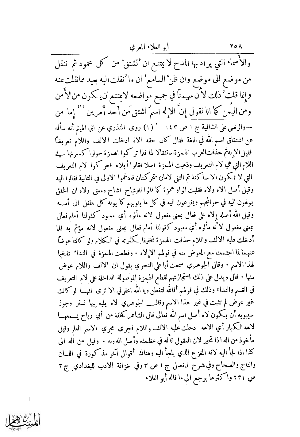 (¬1) روى المنذري عن ابي الهيثم أنه سأله عن اشتقاق اسم الله في اللغة فقال كان حقه ألاه أدخلت الألف واللام تعريضًا فقيل الإله ثم حذفت العرب الهمزة استثقالا لها فلما تركوا الهمزة حولوا كسرتها في اللام التي هي لام التعريف وذهبت الهمزة أصلا فقالوا أبلاه فحركوا لام التعريف التي لا تكون الا ساكنة ثم التقى لامان متحركتان فادغموا الأولى في الثانية فقالوا إليه وقيل أصل الاه ولاه فقلبت الواو همزة كما قالوا للوشاح أشاح ومعنى ولاه أن الخلق يولهون إليه في حوائجهم ويفزعون إليه في كل ما ينوبهم كما يوله كل طفل إلى أمه وقيل الله أصله إلاه على فعال بمعنى مفعول لأنه مألوه أي معبود كقولنا أمام فعال بمعنى مفعول لأنه مألوه أي معبود كقولنا أما فعال بمعنى مفعول لأنه مؤتم به فلما أدخلت عليه الألف واللام حذفت الهمزة تخفيفا لكثرته في الكلام ولو كانت عوضًا عنهما لما اجتمعتا مع المعوض منه في قولهم الإلاه. وقطعت الهمزة في النداء تفخيما لهذا الاسم. وقال الجوهري سمعت أبا علي النحوي يقول أن الألف واللام عوض منها. قال ويدل على ذلك استجازتهم لقطع الهمزة الموصولة الداخلة على لام التعريف في القسم والنداء وذلك في قولهم أفالله لتفعلن ويا الله ااعفر لي الا ترى أنها لو كانت غير عوض لم تثبت في غير هذا الاسم وقال الجوهري لاه بليه بها نستر وجوز سيبويه أن يكون لاه أصل اسم الله تعالى قال الشاعر كحلقة من أبي رياح يسمعها لاهه الكبار أي الاهه دخلت عليه الألف واللام فجرى مجري الاسم العلم وقيل مأخوذ من اله إذا تحير لأن العقول تأله في عظمثه وأصل أله وله. وقيل من أله إلى كذا إذا لجأ إليه لأنه المفزع الذي يلجأ إليه وهناك أقوال آخر مذكورة في اللسان والتاج والصحاح وفي شرح المفصل ج 1 ص 3 وفي خزانة الأدب للبغدادي. ج 2 ص 231 وأكثرها يرجع إلى ما قاله أبو العلاء