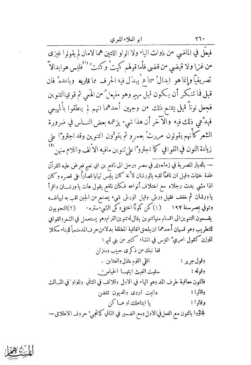 (¬2) النحويون يقسمون التنوين إلى أقسام منها تنوين يقال له تنوين الترنم وهو يستعمل في الشعر والقوافي للتطريب وهو قسمان أحدهما أن يلحق القافية المطلقة بدلا من حرف المدمتممًا للبناء مكملا للوزن كقول امرئ القيس في انشاء كثير من بني تميم: