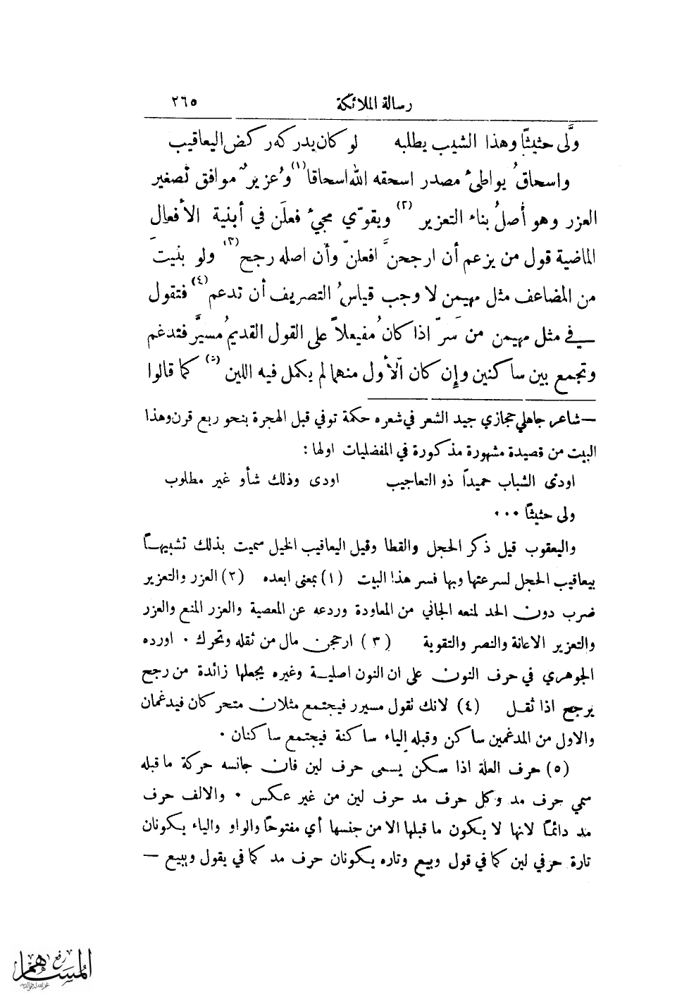 وإسحاق يواطئ مصدر اسحقه الله اسحاقا (¬1) وعزيز موافق تصغير العزر وهو أصل بناء التعزير (¬2) ويقوي مجيء فعلن في أبنية الأفعال الماضية قول من يزعم أن ارجحن افعلن وأن أصله رجح (¬3) ولو بنيت من المضاعف مثل مهيمن لا وجب قياس التصريف أن تدعم (¬4) فتقول في مثل مهيمن من سر إذا كان مفيعلاً على القول القديم مسير فتدغم وتجمع بين ساكنين وإن كان الأول منهما لم يكمل فيه اللين (¬5) كما قالوا