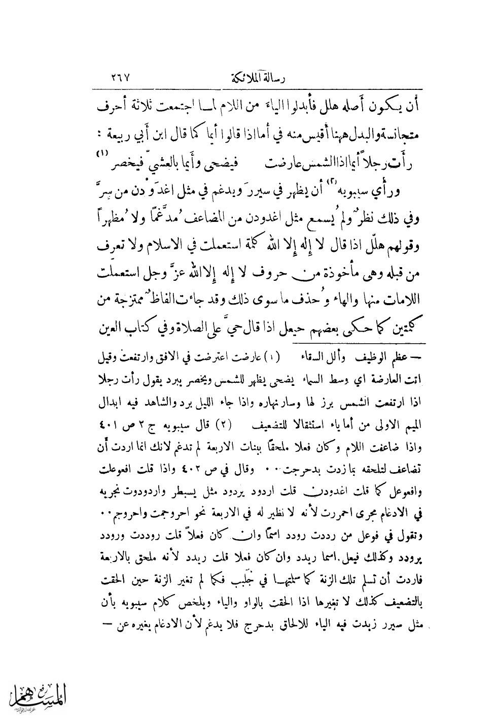 (¬2) قال سيبويه ج 2 ص 401 وإذا ضاعفت اللام وكان فعلا ملحقًا ببنات الأربعة لم تدغم لأنك إنما أردت أن تضاعف لتلحقه بما زدت بدحرجت .. وقال في ص 402 وإذا قلت افعوعات وافعوعل كما قلت اغدودن قلت اردود يردود مثل يسبطر واردودوت نجربه في الادغام مجرى احمررت لأنه لا نظير له في الأربعة نحو احروجمت واحروجم .... وتقول في فوعل من رددت رودد اسمًا وأن كان فعلاً قلت روددت ورودد يرودد وكذلك فيعل. اسما ريدد وأن كان فعلا قلت ريدد لأنه ملحق بالأربعة فاردت أن تسلم تلك الزنة كما سلمتها في جلبب فكما لم تغير الزنة حين الحقت بالتضعيف كذلك لا تغيرها إذا الحقت بالواو والياء ويلخص كلام سيبويه بأن مثل سيرر زيدت فيه الياء للالحاق بدحرج فلا يدغم لأن الادغام يغيره عن =