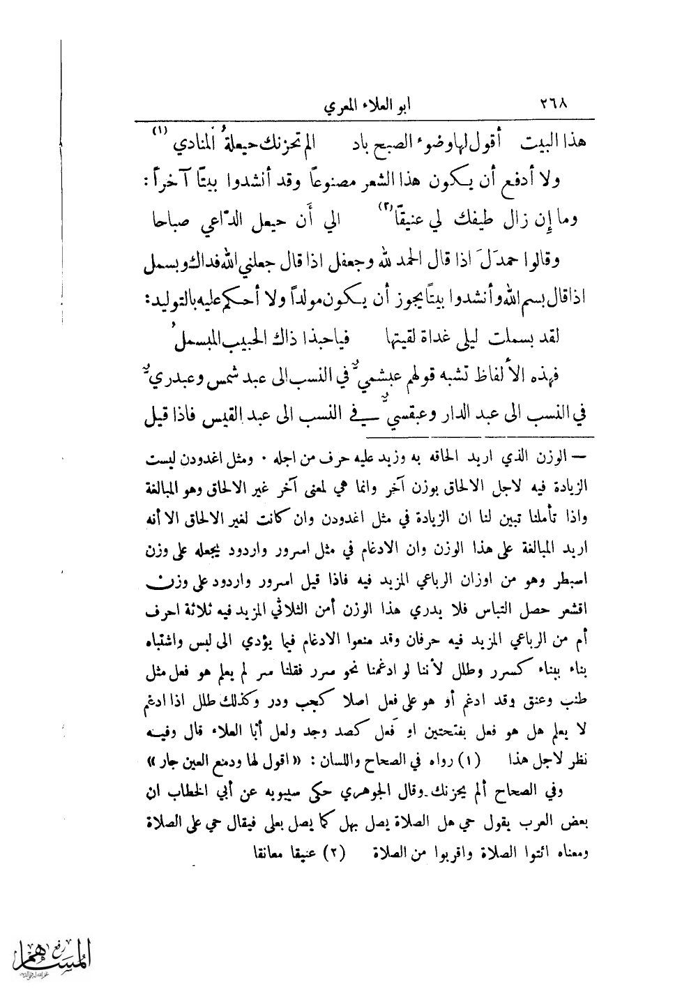 (¬1) رواه في الصحاح واللسان: «اقول لها ودمع العين جار» وفي الصحاح ألم يحزنك وقال الجوهري حكى سيبويه عن أبي الخطاب أن بعض العرب يقول حي هل الصلاة يصل بهل كما يصل بعلى فيقال حي على الصلاة ومعناه ائتوا الصلاة واقربوا من الصلاة