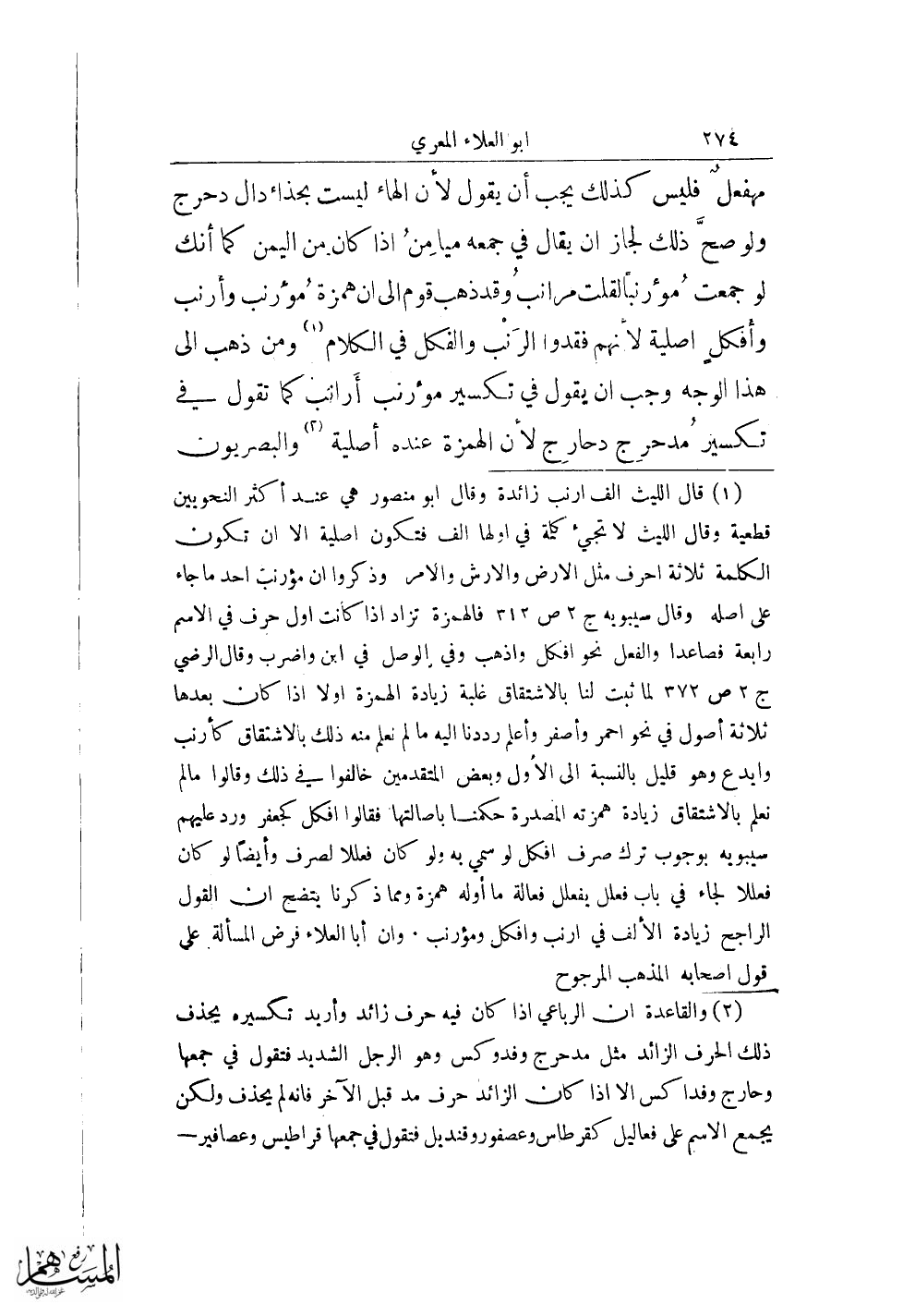 (¬1) قال الليث ألف ارنب زائدة وقال أبو منصور هي عند أكثر النحويين قطعية وقال الليث لا تجيء كلمة في أولها ألف فتكون أصلية ألا أن تكون الكلمة ثلاثة أحرف مثل الأرض والأرش والأمر وذكروا أن مؤرنب أحد ما جاء على أصله وقال سيبويه ج 2 ص 312 فالهمزة تزاد إذا كانت أول حرف في الاسم رابعة فصاعدا والفعل نحو افكل واذهب وفي الوصل في ابن واضرب وقال الرضي ج 2 ص 372 لما ثبت لنا بالاشتقاق غلبة زيادة الهمزة أولا إذا كان بعدها ثلاثة أصول في نحو أحمر وأصفر وأعلم رددن إليه ما لم نعلم منه ذلك بالاشتقاق كأرنب وايدع وهو قليل بالنسبة إلى الأول وبعض المتقدمين خالفوا في ذلك وقالوا ما لم نعلم بالاشتقاق زيادة همزته المصدرة حكمنا باصالتها فقالوا افكل كجعفر ورد عليهم سيبويه بوجوب ترك صرف افكل لو سمي به ولو كان فعللا لصرف وأيضًا لو كان فعللا لجاء في باب فعلل ما أوله همزة ومما ذكرنا بتضح أن القول الراجح زيادة الألف في ارنب وافكل ومؤرنب. وأن أبا العلاء فرض المسألة على قول اصحابه المذهب المرجوح