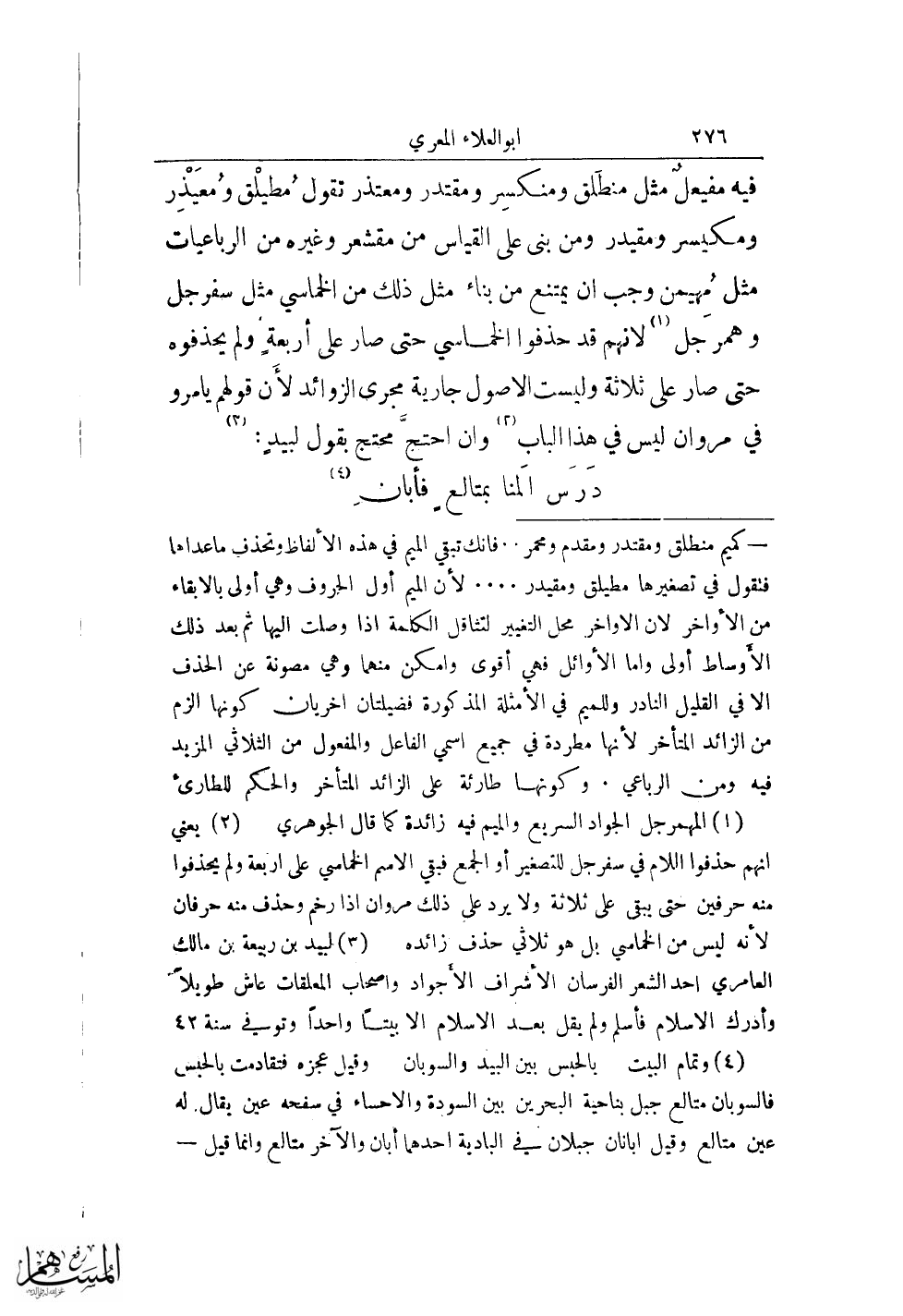فيه مفيعل مثل منطلق ومنكسر ومقتدر ومعتذر تقول مطيلق ومعيذر ومكيسر ومقيدر ومن بني على القياس من مقشعر وغيره من الرباعيات مثل مهيمن وجب أن يمتنع من بناء مثل ذلك من الخماسي مثل سفرجل وهمرجل (¬1) لأنهم قد حذفوا الخماسي حتى صار على أربعة ولم يحذفوه حتى صار على ثلاثة وليست الأصول جارية مجرى الزوائد لأن قولهم يامرو في مروان ليس في هذا الباب (¬2) وأن احتج محتج بقول لبيد: (¬3)