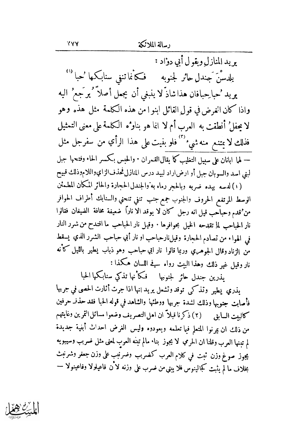 (¬1) لدسه بيده ضربه وبالحجر رماه به والجندل الحجارة والحائر المكان المطمئن الوسط المرتفع الحروف والجنوب جمع جنب تنفي تنحني والسنابك أطراف الحوافر من قدم وحباحب قيل أنه رجل كان لا يوقد ألا نارًا ضعيفة مخافة الضيفان فقالوا نار الحباحب لما تقدحه الخيل بحوافرها. وقيل نار الحباحب ما اقتدح من شرر النار في الهواء من تصادم الحجارة وقيل نار حباحب أو نار أبي حباحب الشرر الذي يسقط من الزناد وقال الجوهري وربما قالوا نار أبي حباحب وهو ذباب يطير بالليل كأنه نار وقيل غير ذلك وهذا البيت رواه في اللسان هكذا: