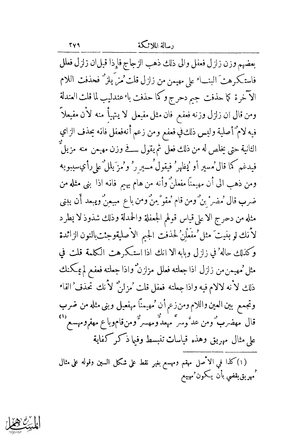 بعضهم وزن زلزل فعفل وإلى ذلك ذهب الزجاج فإذا قبل أن زلزل فعلل فاستكرهت البناء على مهيمن من زلزل قلت مزيلز فحذفت اللام الآخرة كما حذفت جيم دحرج وكما حذفت باء عندليب لما قلت العندلة ومن قال أن زلزل وزنه فعفع فإن مثل مفيعل لا يتهيأ منه لأن مفيعلاً فيه لام أصلية وليس ذلك في فعفع ومن زعم أنه فعفل فإنه يحذف الزاي الثانية حتى يخلص له من ذلك فعل ثم يقول في وزن مهيمن منه مزيل فيدغم كما قال مسير أو يظهر فيقول مسيرر ومزيلل على رأي سيبويه ومن ذهب إلى أن مهيمنًا مفعلن وأنه من هام يهيم فإنه إذا بني مثله من ضرب قال مضربن ومن قام مقو من ومن باع مبيعن ويبعد أن يبني مثله من دحرج ألاعلى قياس قولهم الجعفلة والحمدلة وذلك شذوذ لا يطرد لأنك لو بنيت مثل مفعلن لحذفت الجيم الأصلية وجئت بالنون الزائدة وكذلك حالة في زلزل وبابه إلا أنك إذا استكرهت الكلمة قلت في مثل مهيمن من زلزل إذا جعلته فعلل مزلزن وإذا جعلته فعفع لم يمكنك ذلك لأنه لالام فيه وإذا جعلته فعفل قلت مزلن لأنك تحذف الفاء وتجمع بين العين واللام ومن زعم أن مهيمنًا مهفعيل وبني مثله من ضرب قال مهضرب ومن عدّ وسرّ مهعدّ ومهسرّ ومن قام وباع مهقم ومهسع (¬1) على مثال مهريق وهذه قياسات تنبسط وفيما ذكر كفاية