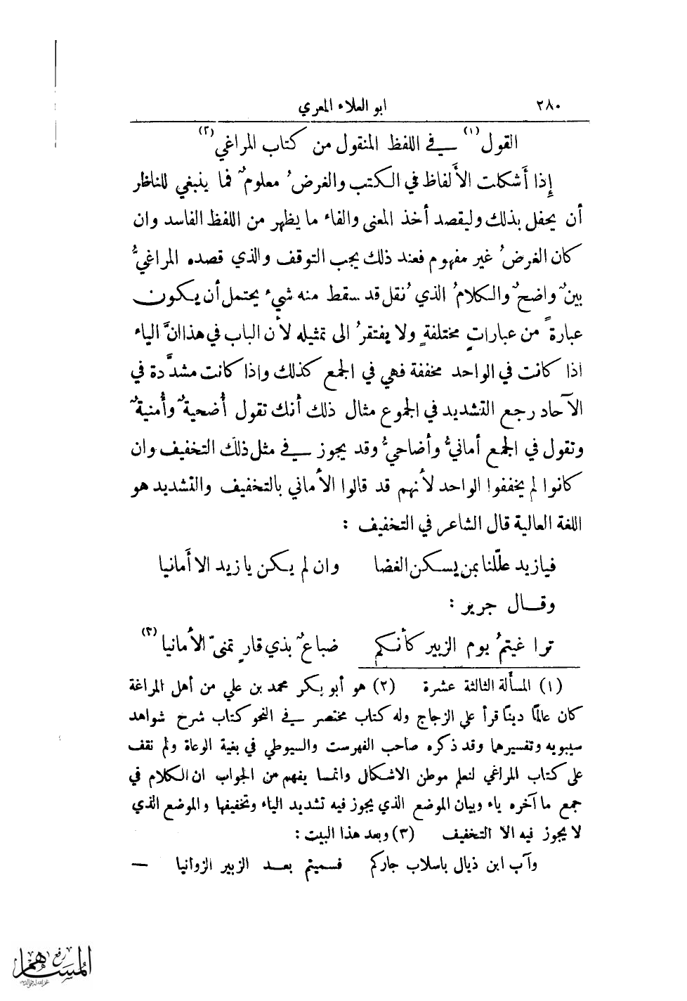إذا أشكلت الألفاظ في الكتب والغرض معلوم فما ينبغي للناظر أن يحفل بذلك وليقصد أخذ المعنى والفاء ما يظهر من اللفظ الفاسد وأن كان الغرض غير مفهوم فعند ذلك يجب التوقف والذي قصده المراغي بين واضح والكلام الذي نقل قد سقط منه شيء يحتمل أن يكون عبارةً من عبارات مختلفة ولا يفتقر إلى تمثيله لأن الباب في هذا أن الياء إذا كانت في الواحد مخففة فهي في الجمعغ كذلك وإذا كانت مشدّدة في الآحاد رجع التشديد في الجموع مثال ذلك أنك تقول أضحية وأمنية وتقول في الجمع أمانيّ وأضاحيّ وقد يجوز في مثل ذلك التخفيف وأن كانوا لم يخففوا الواحد لأنهم قد قالوا الأماني بالتخفيف والتشديد هو اللغة العالية قال الشاعر في التخفيف: