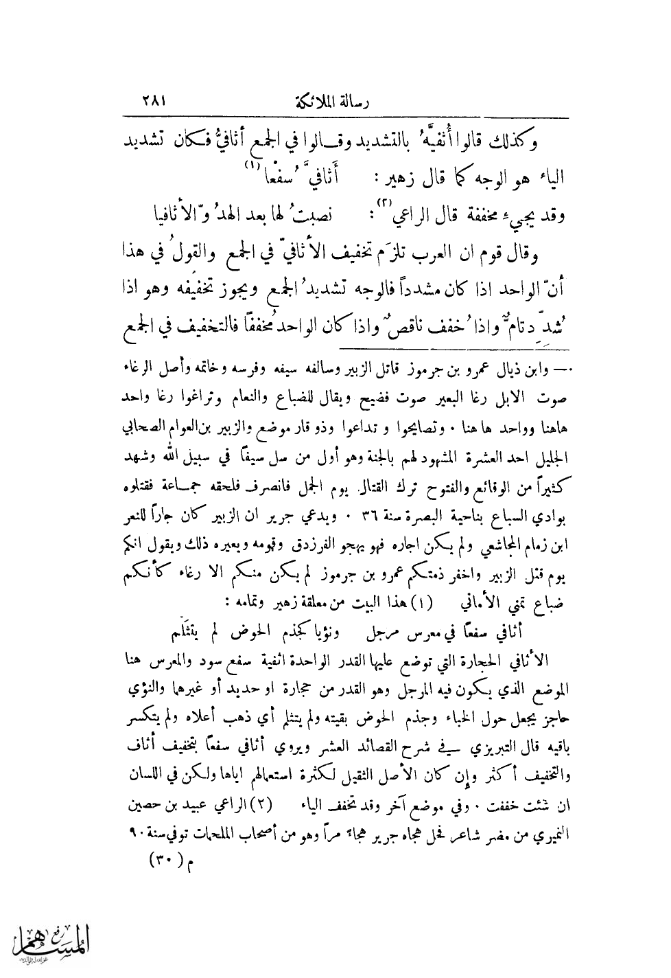 وقال قوم أن العرب تلزم تخفيف الأثافي في الجمع والقول في هذا أن الواحد إذا كان مشددًا فالوجه تشديد الجمع ويجوز تخفيفه وهو إذا شدد تام وإذا خفف ناقص وإذا كان الواحد مخففًا فالتخفيف في الجمع
