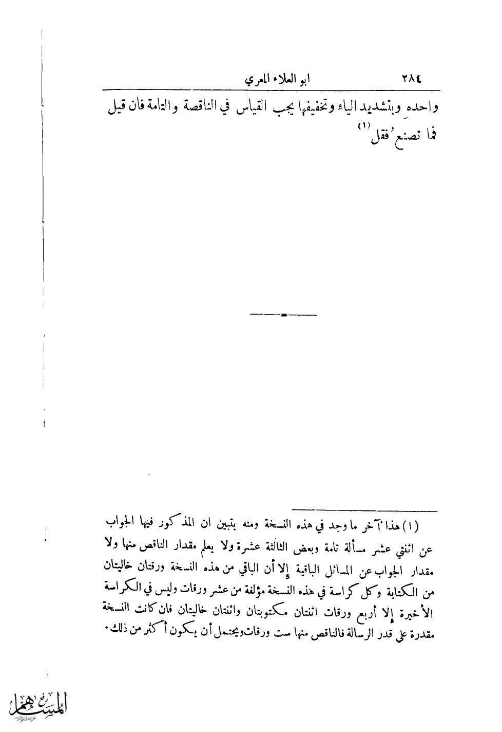 (¬1) هذا آخر ما وجد في هذه النسخة ومنه يتبين أن المذكور فيها الجواب عن اثنتي عشر مسألة تامة وبعض الثالثة عشرة ولا يعلم مقدار الناقص منها ولا مقدار الجواب عن المسائل الباقية إلا أن الباقي من هذه النسخة ورقتان خاليتان من الكتابة وكل كراسة في هذه النسخة مؤلفة من عشر ورقات وليس في الكراسة الأخيرة إلا أربع ورقات اثنتان مكتوبتان واثنتان خاليتان فإن كانت النسخة مقدرة على قدر الرسالة فالناقص منها ست ورقات ويحتمل أن يكون أكثر من ذلك.