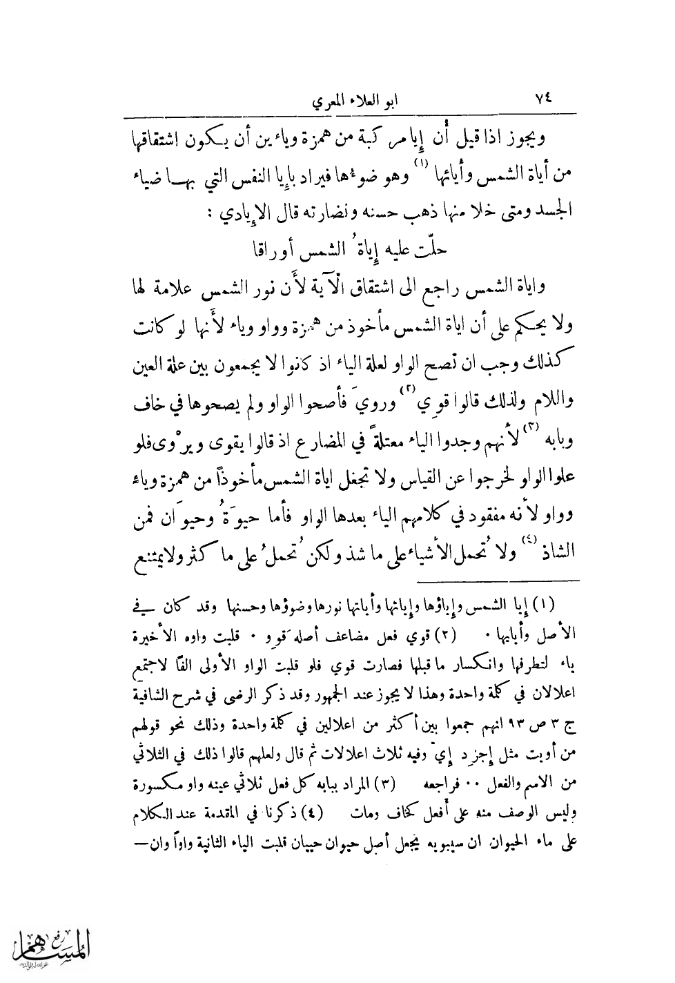 واياة الشمس راجع إلى اشتقاق الآية لأَن فور الشمس علامة لها ولا يحكم على أن اياة الشمس مأخوذ من همزة وواو وياء لأَنها لو كانت كذلك وجب أن تصح الواو لعلة الياء إذ كانوا لا يجمعون بين علة العين واللام ولذلك قالوا قوِي (¬2) ورويَ فأصحوا الواو ولم يصحوها في خاف وبابه (¬3) لأنهم وجدوا الياء معتلًة في المضارع إذ قالوا يقوى ويرْوى فلو علوا الواو لخرجوا عن القياس ولا تجعل اياة الشمس مأخوذًا من همزة وياًء وواو لأنه مفقود في كلامهم الياء بعدها الواو فأما حيوَةُ وحيوَان فمن الشاذ (¬4) ولا تُحمل الأشياء على ما شذ ولكن تُحملُ على ما كثرو لا يمتنع