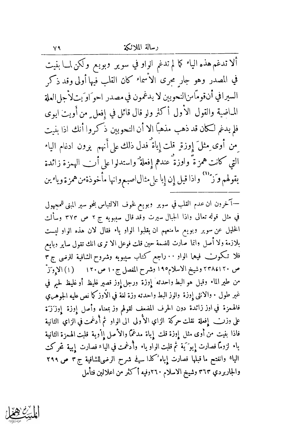 ألا تدغم هذه الياء كما لم تدغم الواو في سوير وبويع ولكن لما بنيت في المصدر وهو جاٍر مجرى الأسماء كان القلب فيها أولى وقد ذكر السيرافي أن قومًا من النحويين لا يدغمون في مصدر احواَاوَيت لأجل العلة الماضية والقول الأول أكثر ولو قال قائل في إفعٍل من أَوبت ايوى فلم يدغم لكان قد ذهب مذهبًا إلا أن النحويين ذكروا أنك إذا بنيت مِن أوى مِثلَ إِوزٍة قلت إِياةٌ فدل ذلك على أَنهم يرون إدغام الياء التي كانت همزًة واوزةٌ عندهم إفعلةٌ واستدلوا على أن الهمزة زائدة بقولهم وَزّ (¬1) وإذا قيل إِن إِبا على مثال أصبع وأنها مأخوذة من همزة وياءين