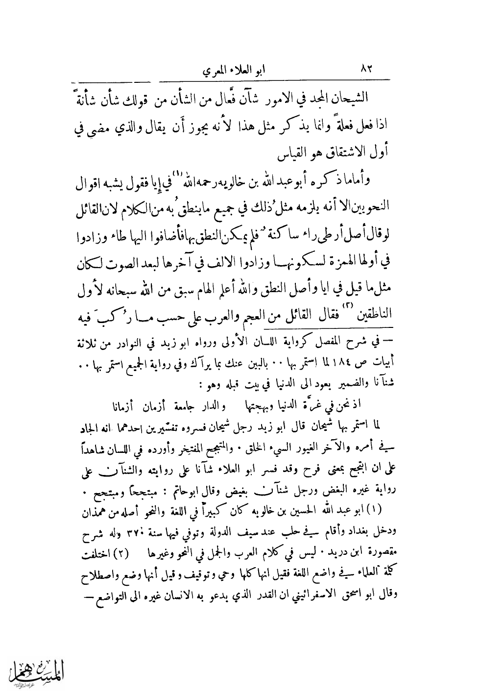 لما استمر بها شيحان قال أبو زيد رجل شيحان فسروه تفسيرين أحدهما أنه الجاد في أمره والآخر الغيور السيء الخلق. والمتبجح المفتخر وأورده في اللسان شاهدًا على أن التبجح بمعنى فرح وقد فسر أبو العلاء شآنا على روايته والشنآن على رواية غيره البغض ورجل شنآن بغيض وقال أبو حاتم: مبتجحًا ومبتجح.