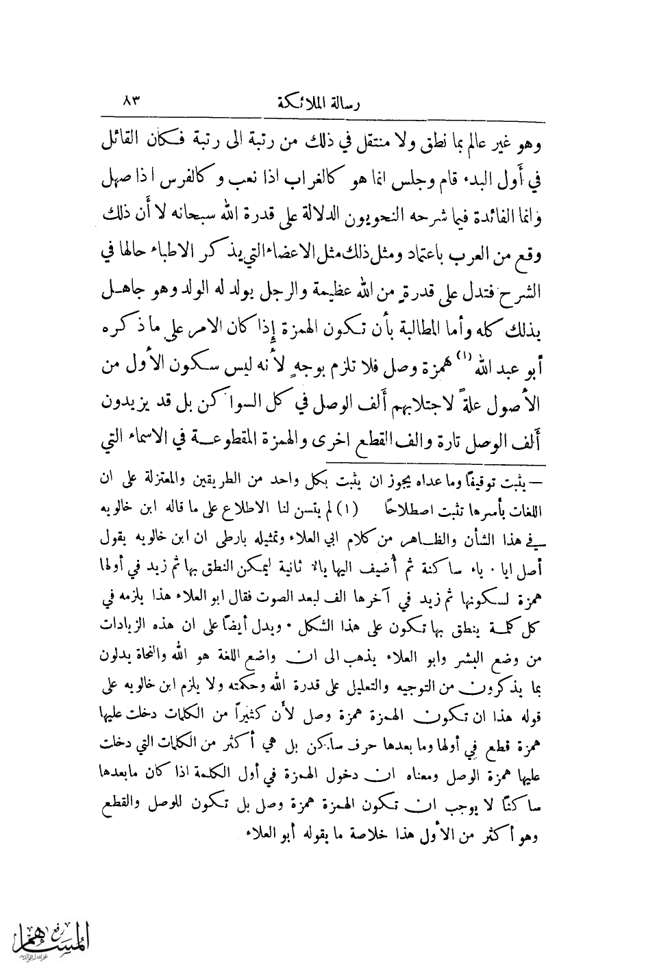 (¬1) لم يتسن لنا الاطلاع على ما قاله ابن خالويه في هذا الشأن والظاهر من كلام أبي العلاء وتمثيله بارطى أن ابن خالويه يقول أصل ايا. ياء ساكنة ثم أضيف إليها ياه ثانية ليمكن النطق بها ثم زيد في أولها همزة لسكونها ثم زيد في آخرها الف لبعد الصوت فقال أبو العلاء هذا يلزمه في كل كلمة ينطق بها تكون على هذا الشكل. ويدل أيضًا على أن هذه الزيادات من وضع البشر وأبو العلا يذهب إلى أن واضع اللغة هو الله والنحاة يدلون بما يذكون من التوجيه والتعليل على قدرة الله وحكمته ولا يلزم ابن خالويه على قوله هذا أن تكون الهمزة همزة وصل لأن كثيرًا من الكلمات دخلت عليها همزة قطع في أولها وما بعدها حرف ساكن بل هي أكثر من الكلمات التي دخلت عليها همزة الوصل ومعناه أن دخول الهمزة في أول الكلمة إذا كان ما بعدها ساكنًا لا يوجب أن تكون الهمزة همزة وصل بل تكون للوصل والقطع وهو أكثر من الأول هذا خلاصة ما يقوله أبو العلاء