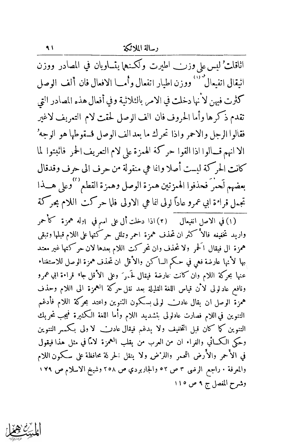 (¬2) إذا دخلت أل على اسم في أوله همزة كأحمر واريد تخفيفه فالأكثر أن تحذف همزة أحمر وتقلى حركتها على اللام قبلها وتبقى همزة ال فيقال الحمر ولا تحذف وأن تحركت اللام بعدها لأن حركتها غير معتد بها لأنها عارضة فهي في حكم الساكن والأقل أن تحذف همزة الوصل للاستغناء عنها بحركة اللام وأن كانت عارضة فيقال لحمر وعلى الأقل جاء قراءة أبي عمرو ونافع عاد لولى لأن قياس اللغة القليلة بعد نقل حركة الهمزة إلى اللام وحذف همزة الوصل أن يقال عادن لولى بسكون التنوين واعتد بحركة اللام فأدغم التنوين في اللام فصارت عادلولى بتشديد اللام وأما اللغة الكثيرة فيجب تحريك التنوين كما كان قبل التخفيف ولا يدغم فيقال عادن لا ولى بكسر التنوين وحكى الكسائي والفراء أن من العرب من يقلب الهمزة لامًا في مثل هذا فيقول في الأحمر والأرض اللحمر واللرض ولا ينقل الحركة محافظة على سكون اللام والمعرفة. راجع الرضى 3 ص 52 والجاربردي ص 258 وشيخ الإسلام ص 129 وشرح المفصل ج 9 ص 115