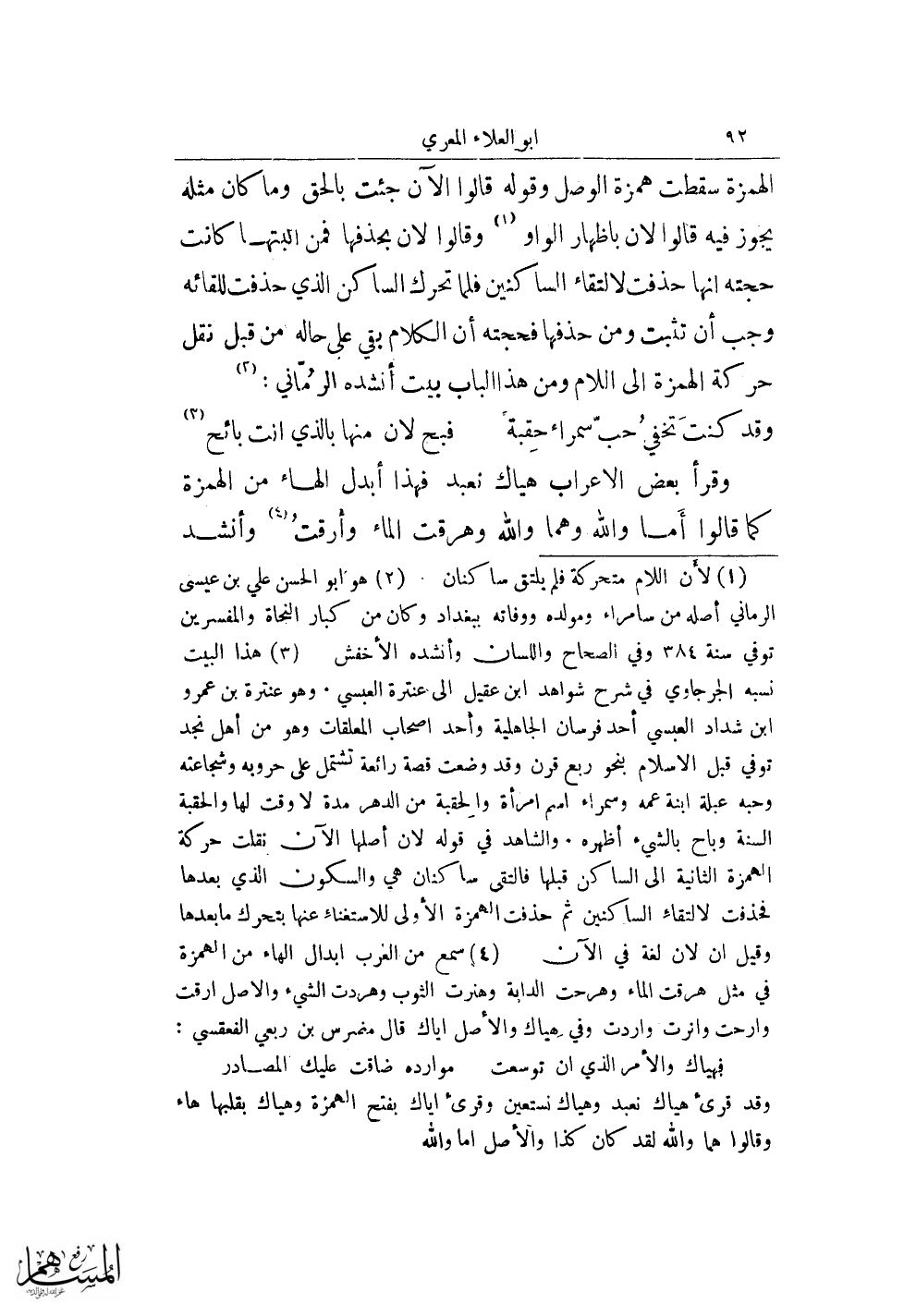 (¬3) هذا البيت نسبه الجرجاوي في شرح شواهد ابن عقيل إلى عنترة العبسي. وهو عنترة بن عمرو ابن شداد العبسي أحد فرسان الجاهلية وأحد أصحاب المعلقات وهو من أهل نجد توفي قبل الإسلام بنحو ربع قرن وقد وضعت قصة رائعة تشتمل على حروبه وشجاعته وحبه عبلة ابنة عمه وسمراء اسم امرأة والحقبة من الدهر مدة لا وقت لها والحقبة السنة وباح بالشيء أظهره. والشاهد في قوله لأن أصلها الآن نقلت حركة الهمزة الثانية إلى الساكن قبلها فالتقى ساكنان هي والسكون الذي بعدها فحذفت لالتقاء الساكنين ثم حذفت الهمزة الأولى للاستغناء عنها بتحرك ما بعدها وقيل أن لأن لغة في الآن