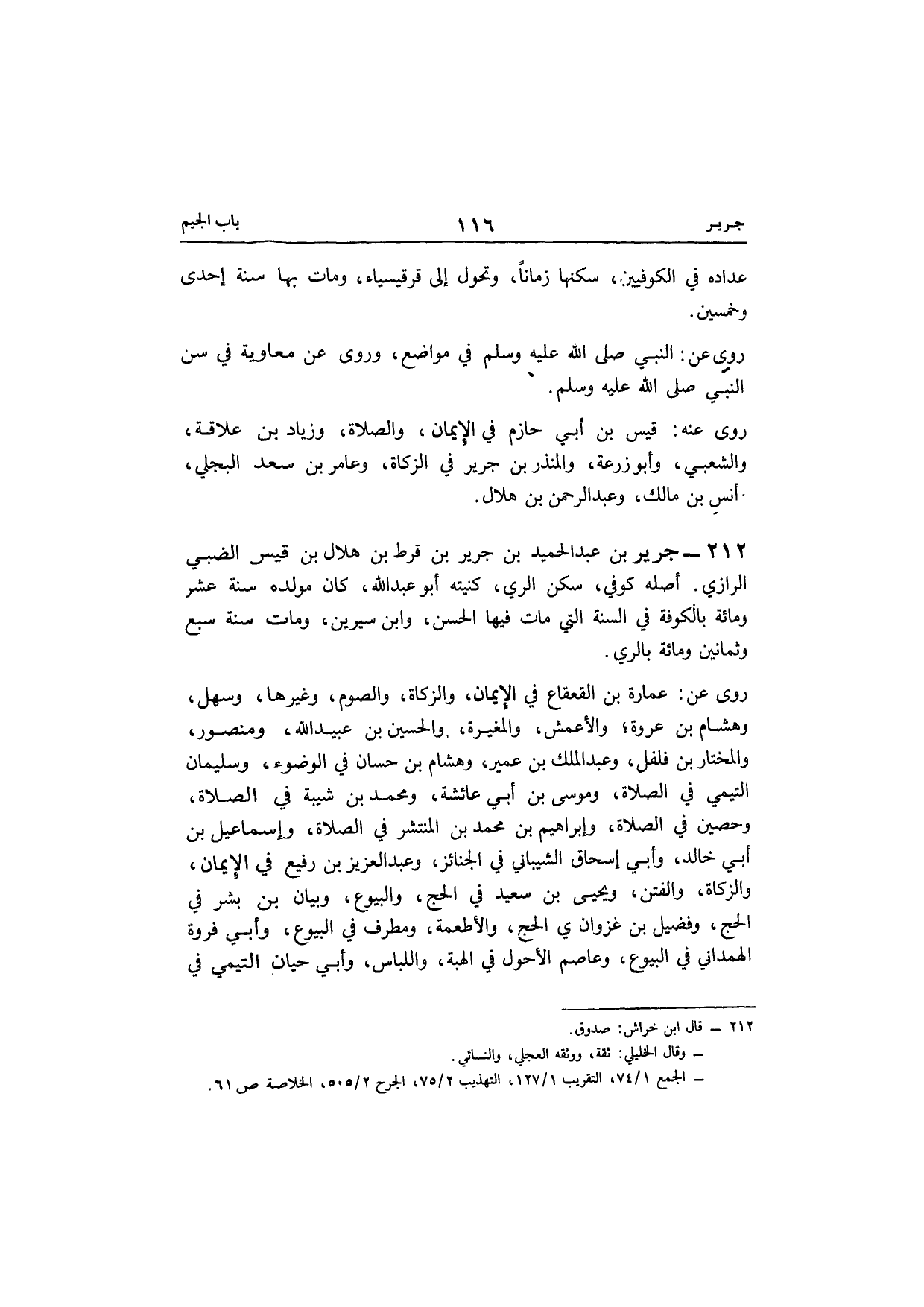 212 - جرير بن عبد الحميد بن جرير بن قرط بن هِلَال بن قيس الضَّبِّيّ الرَّازِيّ أَصله كُوفِي سكن الرّيّ كنيته أَبُو عبد الله كَانَ مولده سنة عشر وَمِائَة بِالْكُوفَةِ فِي السّنة الَّتِي مَاتَ فِيهَا الْحسن وَابْن سِيرِين وَمَات سنة سبع وَثَمَانِينَ وَمِائَة بِالريِّ