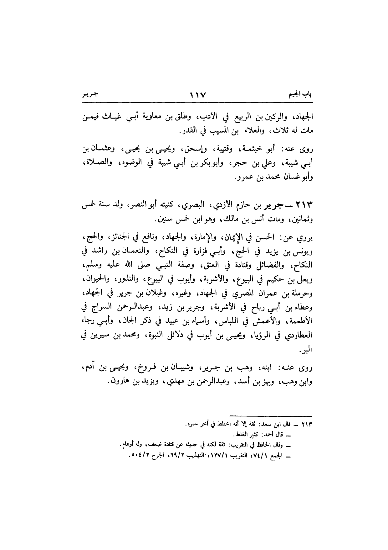 213 - جرير بن حَازِم الْأَزْدِيّ الْبَصْرِيّ كنيته أَبُو النَّصْر ولد سنة خمس وَثَمَانِينَ وَمَات أنس بن مَالك وَهُوَ ابْن خمس سِنِين