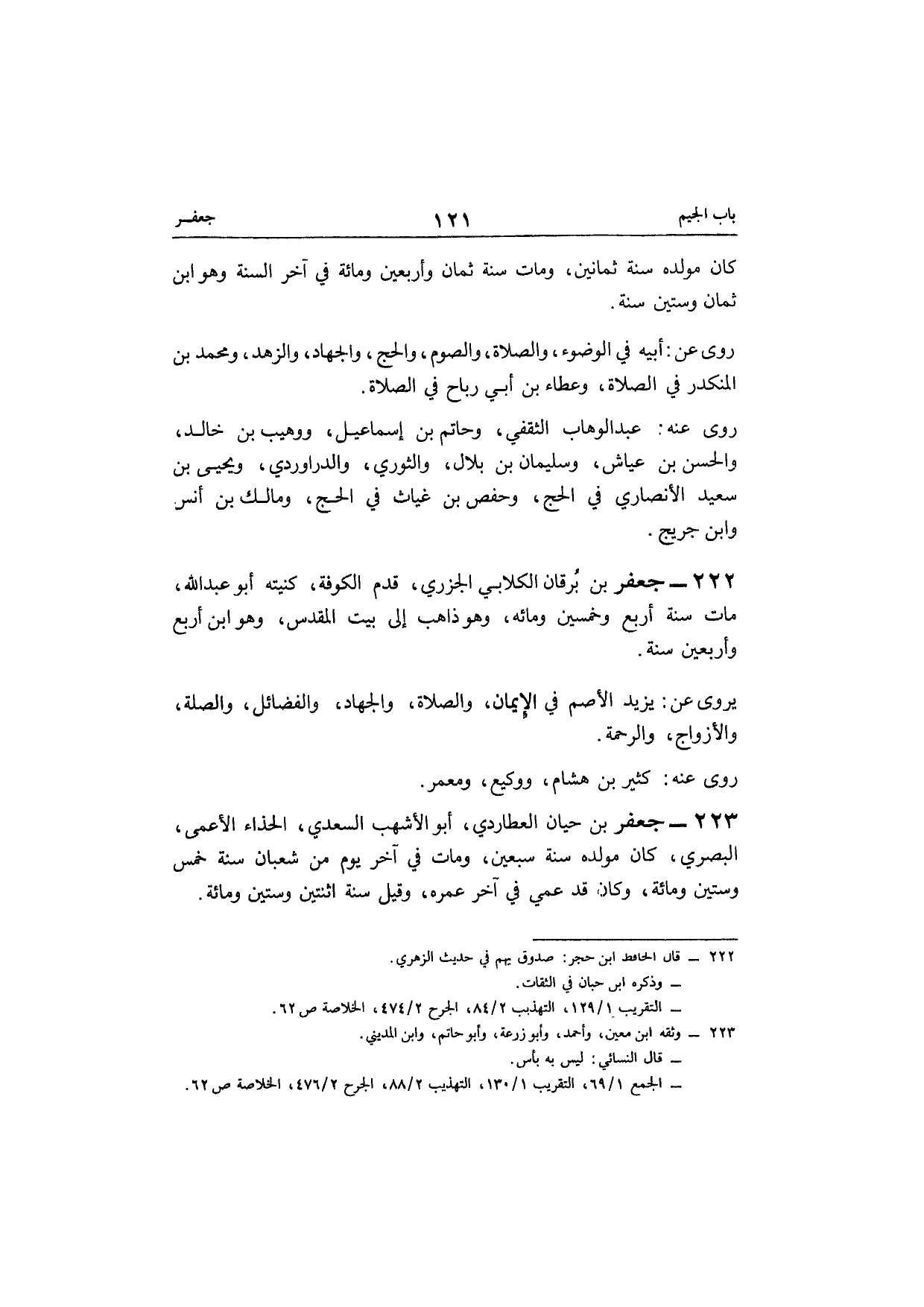222 - جَعْفَر بن برْقَان الْكلابِي الْجَزرِي قدم الْكُوفَة كنيته أَبُو عبد الله مَاتَ سنة أَربع وَخمسين وَمِائَة وَهُوَ ذَاهِب الى بَيت الْمُقَدّس وَهُوَ ابْن أَربع وَأَرْبَعين سنة