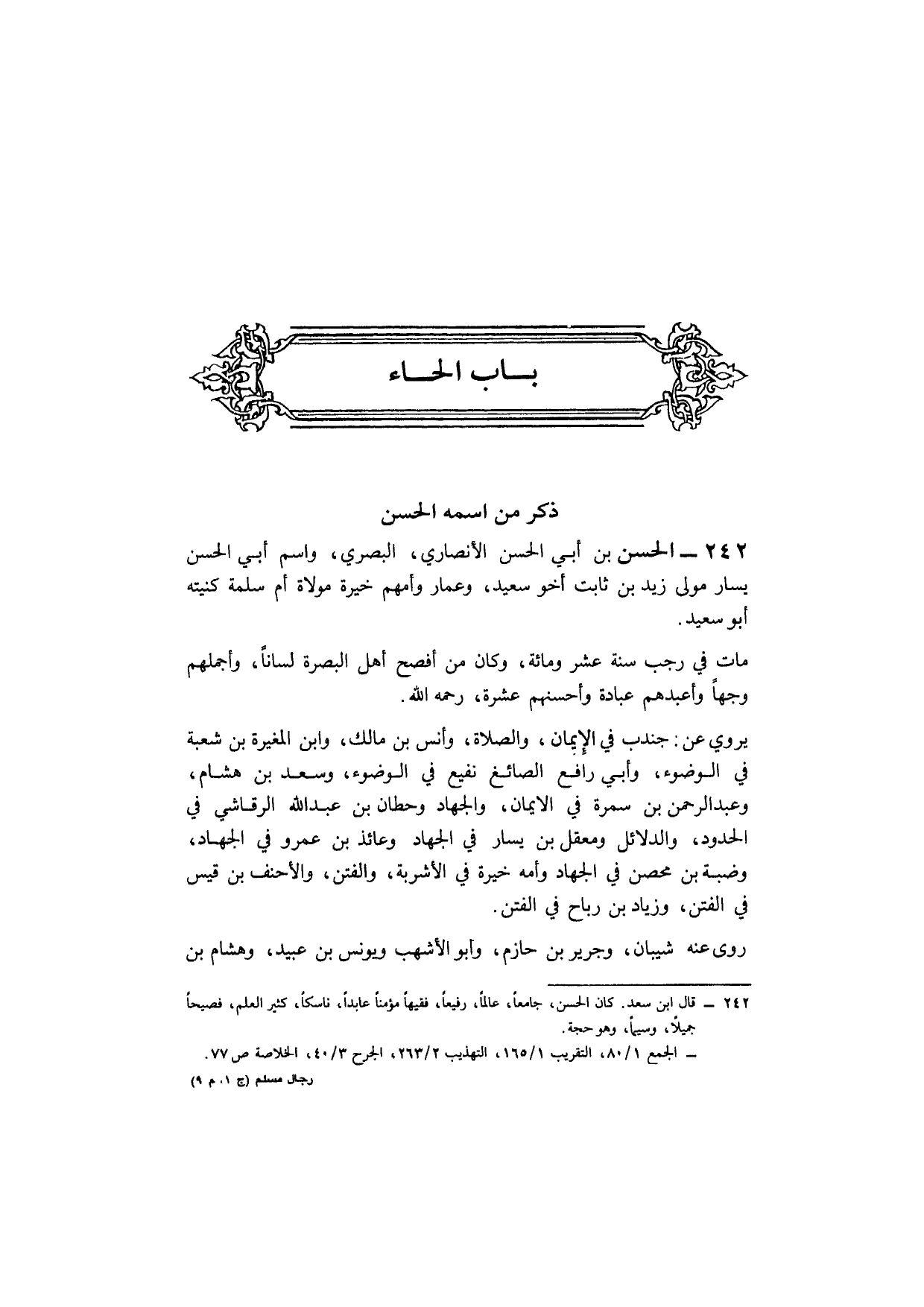 242 - الْحسن بن أبي الْحسن الْأنْصَارِيّ الْبَصْرِيّ وسام أبي الْحسن يسَار مولى زيد بن ثَابت أَخُو سعيد وعمار وأمهم خيرة مولاة أم سَلمَة كنيته أَبُو سعيد