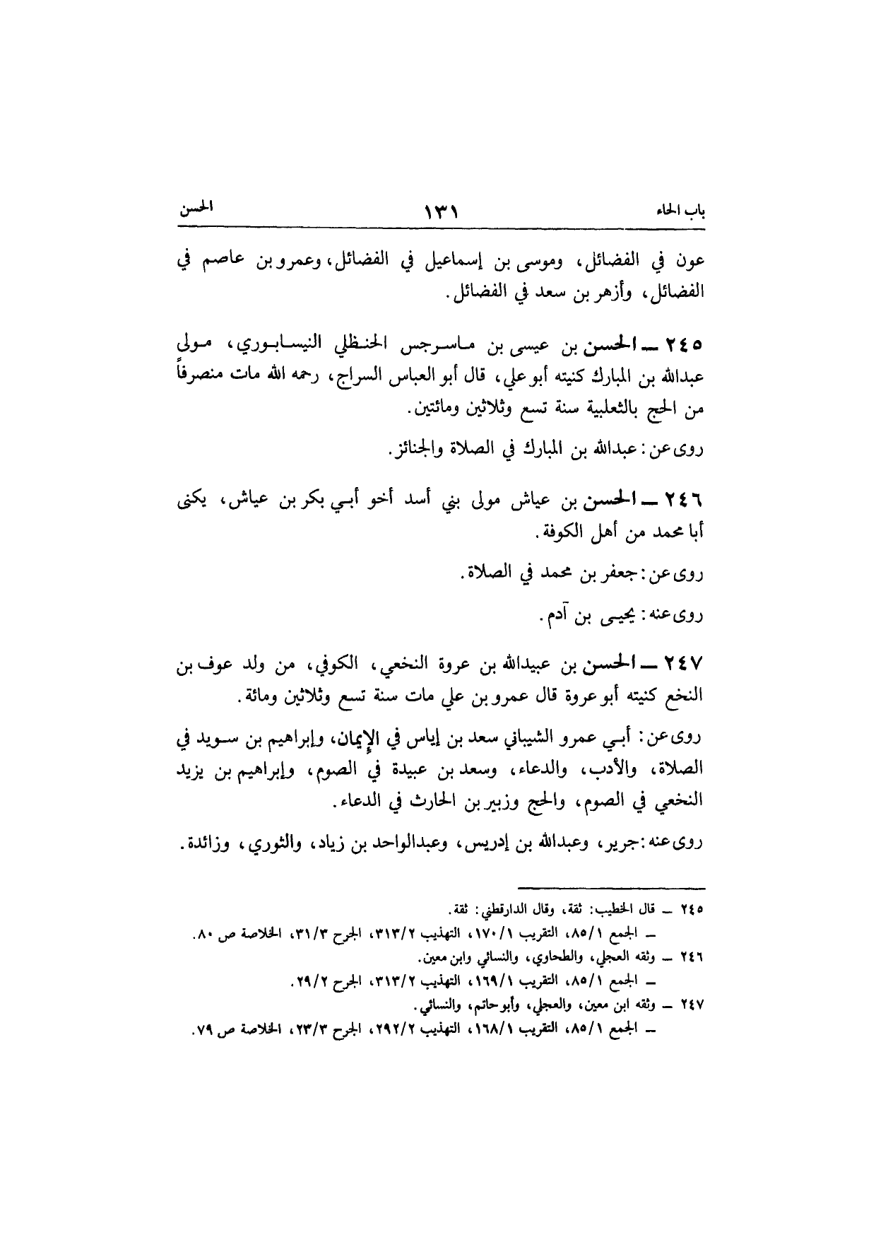 245 - الْحسن بن عِيسَى بن ماسرجس الْحَنْظَلِي النَّيْسَابُورِي مولى عبد الله بن الْمُبَارك كنيته أَبُو عَليّ قَالَ أَبُو الْعَبَّاس السراج رَحمَه الله مَاتَ منصرفا من الْحَج بالثعلبية سنة تسع وَثَلَاثِينَ وَمِائَتَيْنِ