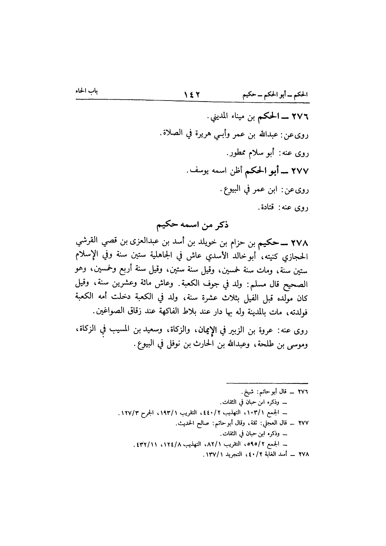 278 - حَكِيم بن حزَام بن خويلد بن أَسد بن عبد العزى بن قصي الْقرشِي الْحِجَازِي كنيته أَبُو خَالِد الْأَسدي عَاشَ فِي الْجَاهِلِيَّة سِتِّينَ سنة وَفِي الْإِسْلَام سِتِّينَ سنة وَمَات سنة خمسين وَقيل سنة سِتِّينَ وَقيل سنة أَربع وَخمسين وَهُوَ الصَّحِيح قَالَ مُسلم ولد فِي جَوف الْكَعْبَة وعاش مائَة وَعشْرين سنة وَقيل كَانَ مولده قبل الْفِيل بِثَلَاث عشرَة سنة ولد فِي الْكَعْبَة دخلت أمه الْكَعْبَة فولدته مَاتَ بِالْمَدِينَةِ وَله بهَا دَار عِنْد بلاط الْفَاكِهَة عِنْد زقاق الصواغين