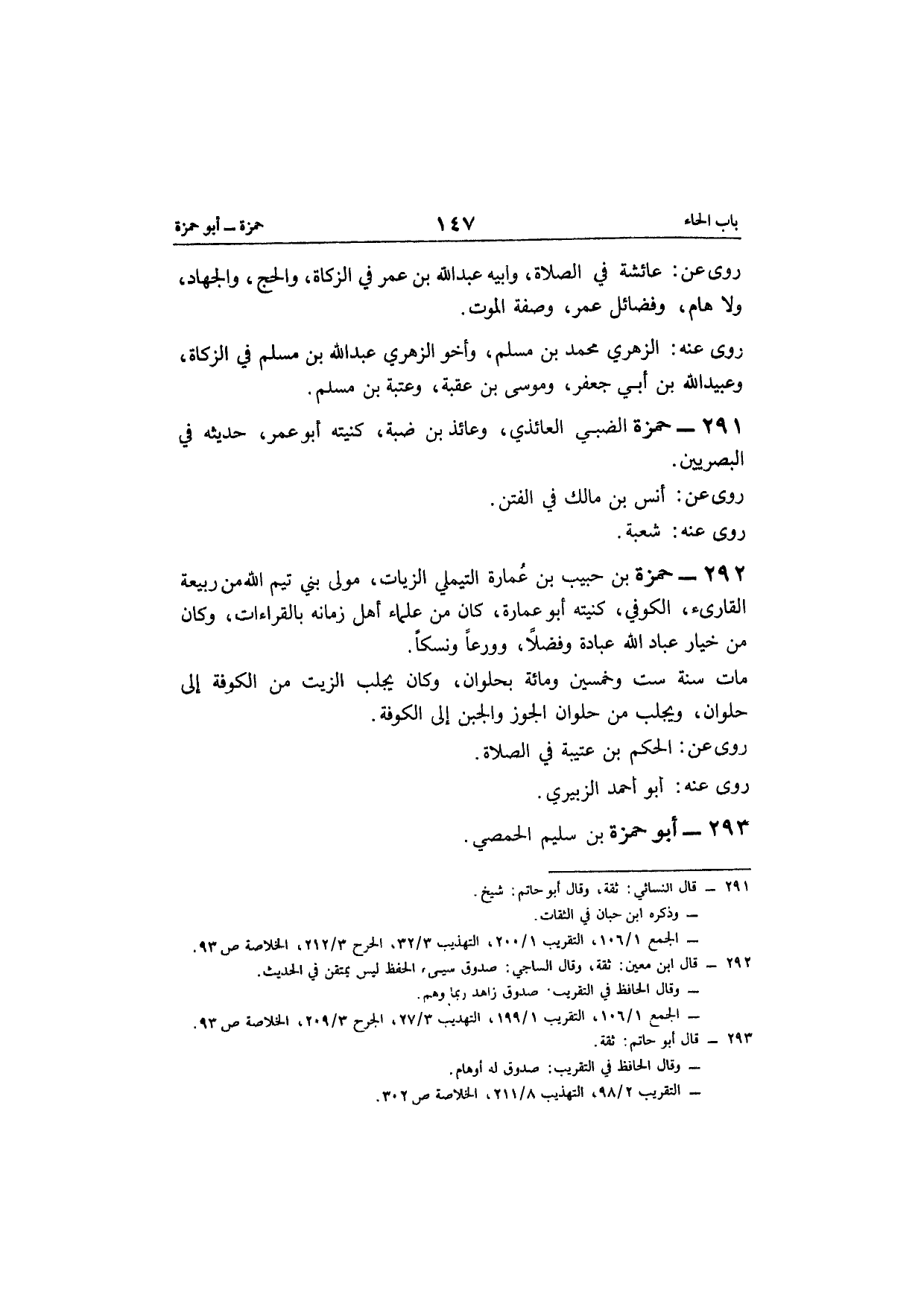 292 - حَمْزَة بن حبيب بن عمَارَة التيملي الزيات مولى بني تيم الله من ربيعَة القارىء الْكُوفِي كنيته أَبُو عمَارَة كَانَ من عُلَمَاء أهل زمانة بالقراءات وَكَانَ من خِيَار عباد الله عبَادَة وفضلا وورعا ونسكا