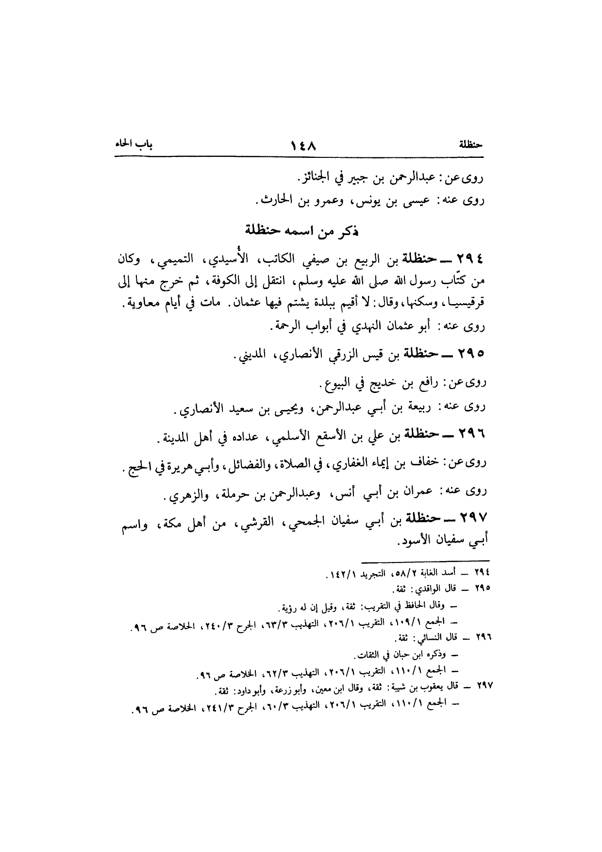 294 - حَنْظَلَة بن الرّبيع بن صَيْفِي الْكَاتِب الأسيدي التَّمِيمِي وَكَانَ من كتاب رَسُول الله صلى الله عَلَيْهِ وَسلم انْتقل الى الْكُوفَة ثمَّ خرج مِنْهَا الى قرقيسيا وسكنها وَقَالَ لَا أقيم ببلدة يشْتم فِيهَا عُثْمَان مَاتَ فِي أَيَّام مُعَاوِيَة