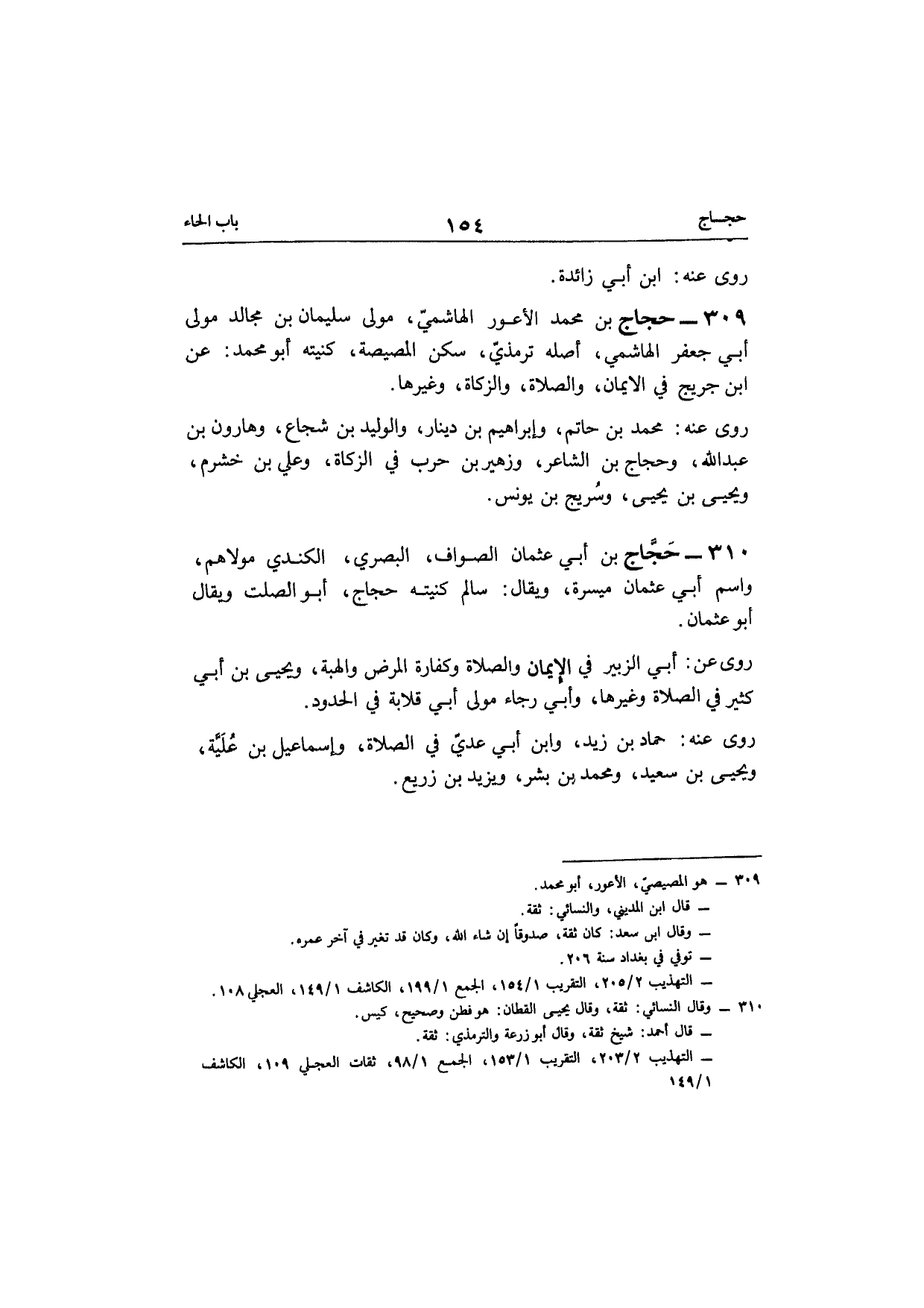 309 - حجاج بن مُحَمَّد الْأَعْوَر الْهَاشِمِي مولى سُلَيْمَان بن مجَالد مولى أبي جَعْفَر الْهَاشِمِي أَصله ترمذي سكن المصيصة كنيته أَبُو مُحَمَّد عَن ابْن جريج فِي الايمان وَالصَّلَاة وَالزَّكَاة وَغَيرهَا