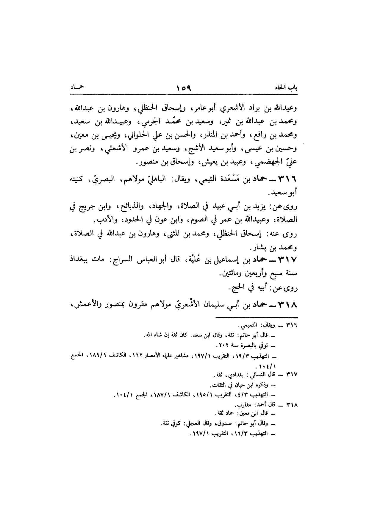 318 - حَمَّاد بن أبي سُلَيْمَان الْأَشْعَرِيّ مَوْلَاهُم مقرون بمنصور وَالْأَعْمَش وَاسم أبي سُلَيْمَان مُسلم مولى إِبْرَاهِيم بن أبي مُوسَى الْكُوفِي كنيته أَبُو إِسْمَاعِيل كَانَ الْأَعْمَش يسيء الرَّأْي فِيهِ قَالَ عَمْرو بن عَليّ مَاتَ سنة عشْرين وَمِائَة
