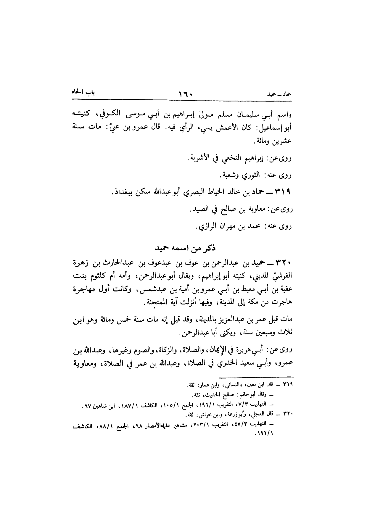 320 - حميد بن عبد الرحمن بن عَوْف بن عبد عَوْف بن عبد الحارث بن زهرَة الْقرشِي الْمَدِينِيّ كنيته أَبُو إِبْرَاهِيم وَيُقَال أَبُو عبد الرحمن وَأمة أم كُلْثُوم بنت عقبَة بن أبي معيط بن أبي ععمرو بن أُميَّة بن عبد شمس وَكَانَت أول مهاجرة هَاجَرت من مَكَّة الى الْمَدِينَة وفيهَا أنزلت آيَة الممتحنة