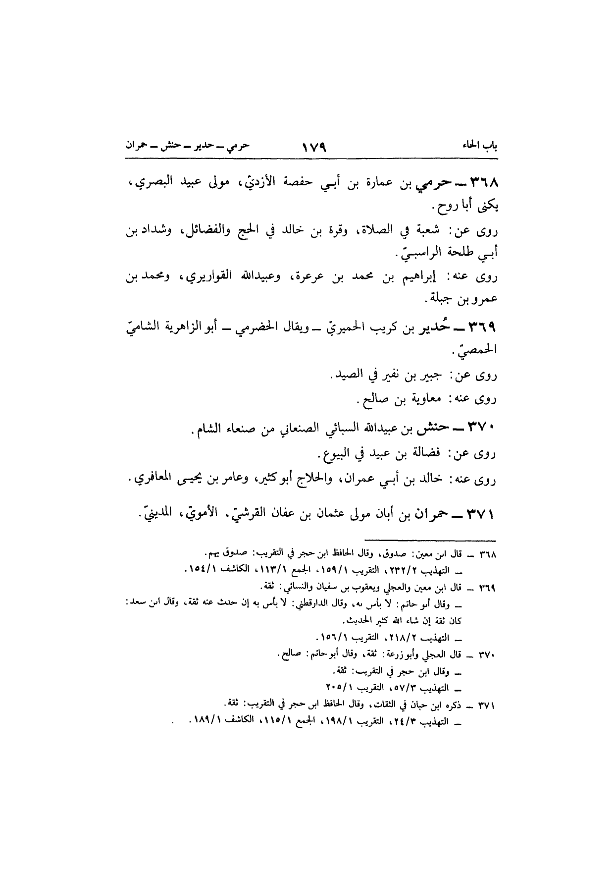 369 - حدير بن كريب الْحِمْيَرِي وَيُقَال الْحَضْرَمِيّ أَبُو الزَّاهِرِيَّة الشَّامي الْحِمصِي